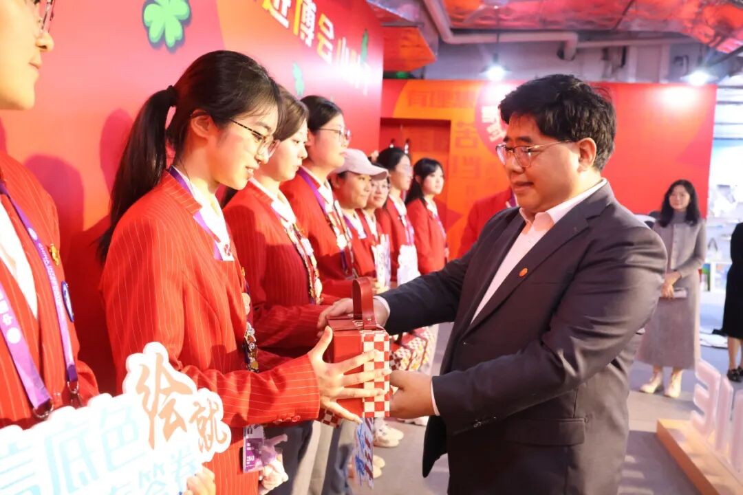 王军华向前来参与交流的嘉宾代表赠送原创“信young进博”纪念徽章。