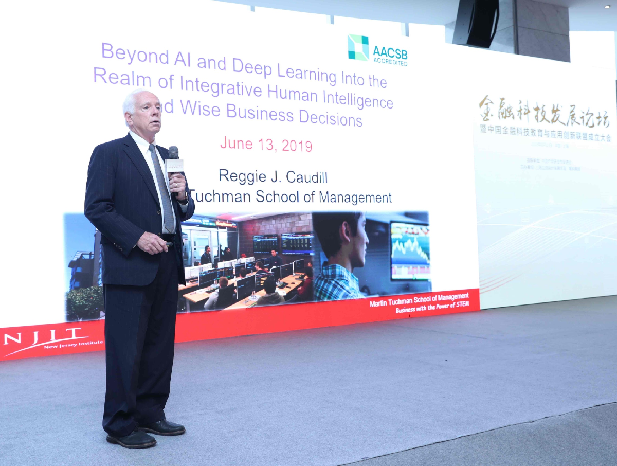 在主题演讲阶段,四位国内外多个领域的专家、学者分别从不同角度围绕金融科技做了深入浅出的主题演讲。新泽西理工学院管理学院院长、松下可持续发展讲席教授Reggie J. Caudill做了主题为《Beyond AI and Deep Learning Into the Realm of Integrative Human Intelligence and Wise Business Decisions》的演讲,回顾技术与商业转型时代的发展历程,讲述金融科技的创新、发展以及未来趋势。