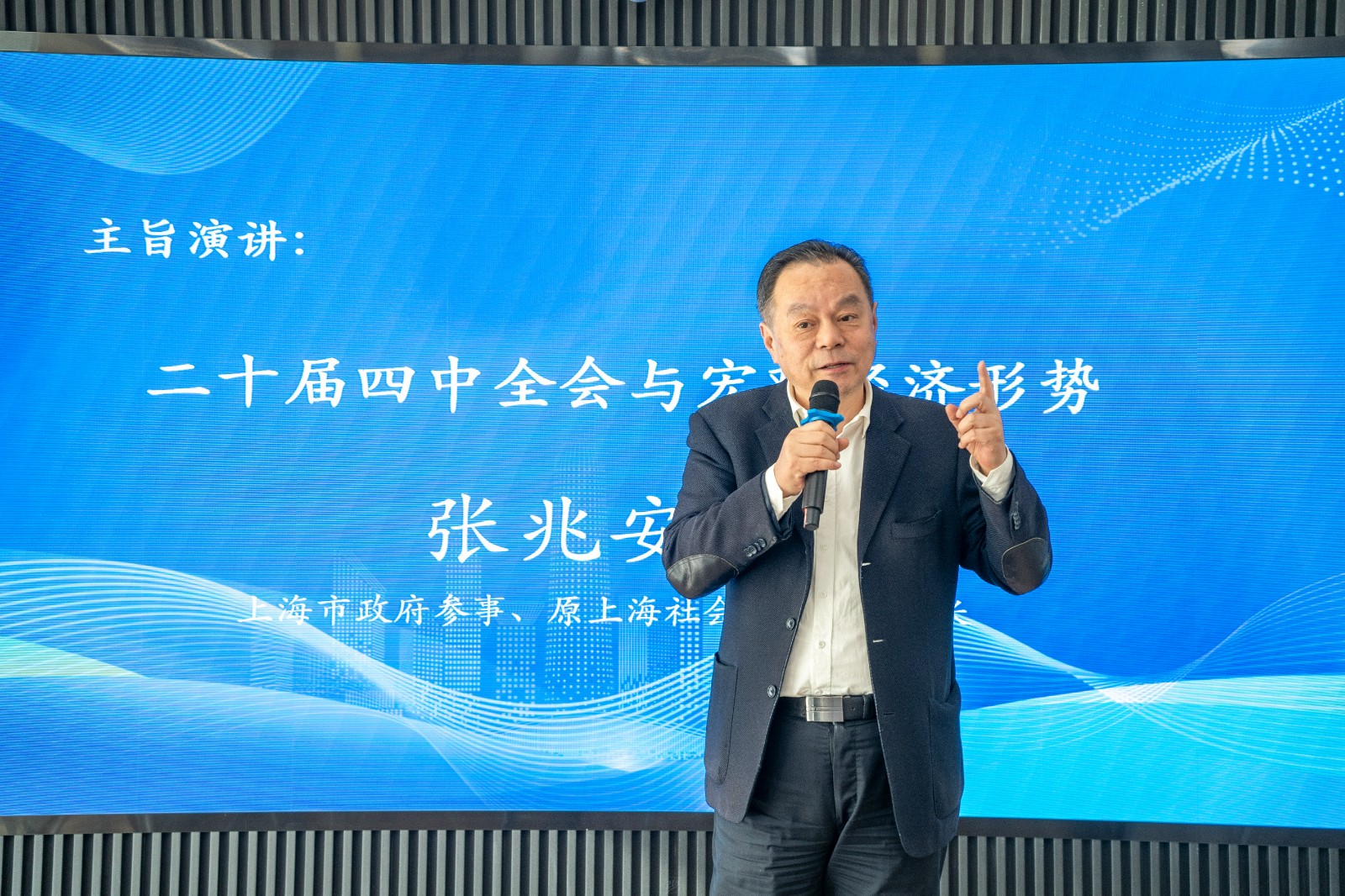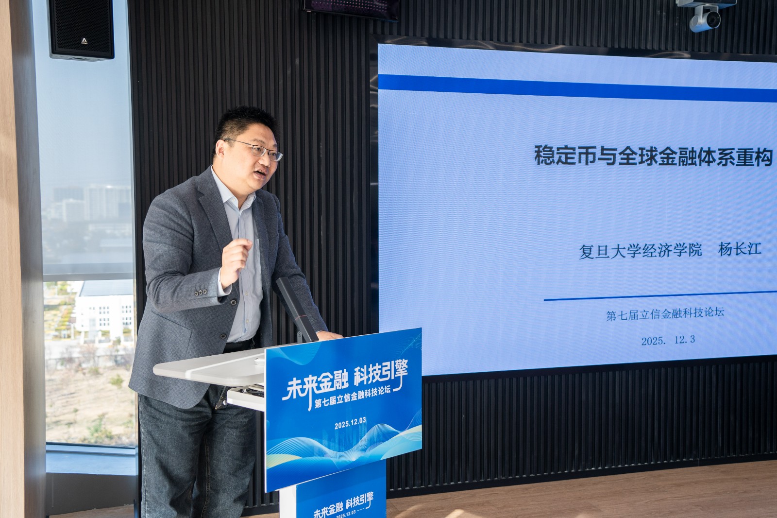 张兆安从国家政策与宏观经济背景出发,为金融科技在未来发展中的定位提供了清晰的政策解读与趋势研判。他剖析了当前国际国内形势与应对策略,分析了中国民间投资和出口增长面临的挑战,并从公有制经济、自主开发、区域协调发展、主体功能区战略等方面解读了党的二十届四中全会精神。杨长江作题为“稳定币与全球金融体系重构”的报告。他指出,稳定币是“代币化”时代货币形态演进的关键产物,正推动全球金融体系进入以“数字复本”为特征的第二次历史性重构。他从货币演进与全球化双重视角,系统剖析了稳定币的本质、动力与深远影响,深入分析了数字货币浪潮下全球金融格局的深刻演变,并就其潜在影响与现场嘉宾进行了互动交流。主旨演讲由金融科技学院院长殷林森主持。