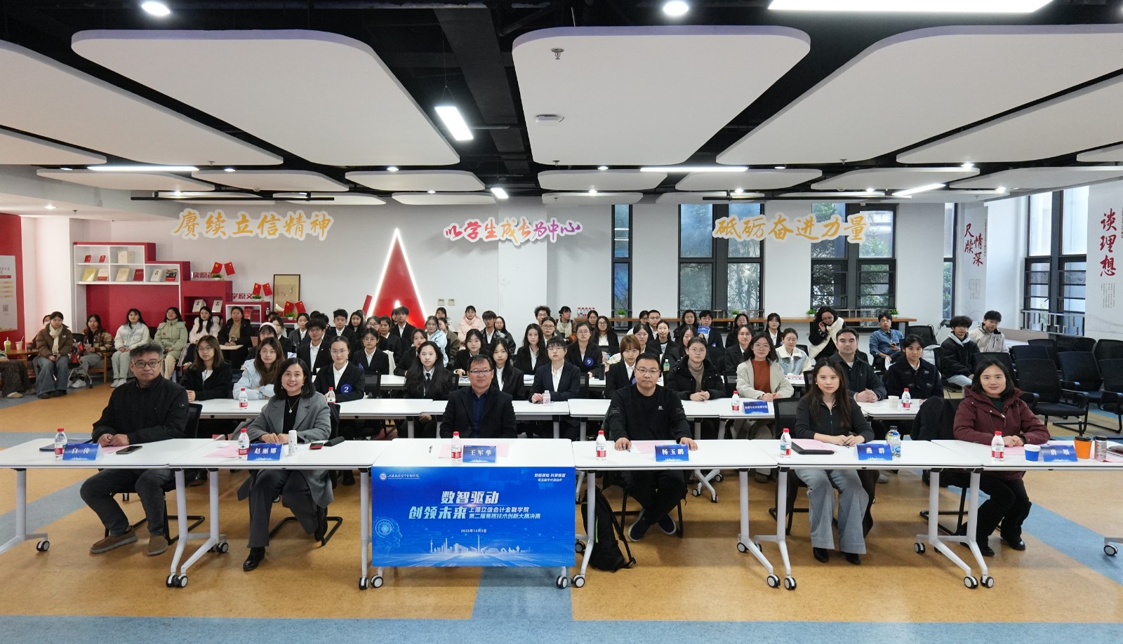 本届大赛设置“自主应用研发”“创新创意方案”“人工智能体AIGC应用”及“虚拟现实技术应用”四个赛道,自10月启动以来,共吸引10个学院的78支队伍报名参赛。经过学院初审、专家评审,23支优秀团队脱颖而出、晋级决赛。决赛现场,各参赛团队通过汇报答辩全面展示项目成果,评委结合作品质量和现场表现进行综合评审,最终评选出一等奖2项、二等奖4项、三等奖6项及优胜奖若干。计算机与人工智能学院、金融科技学院、统计与数学学院获“优秀组织奖”。