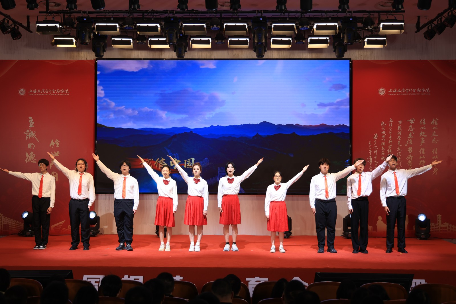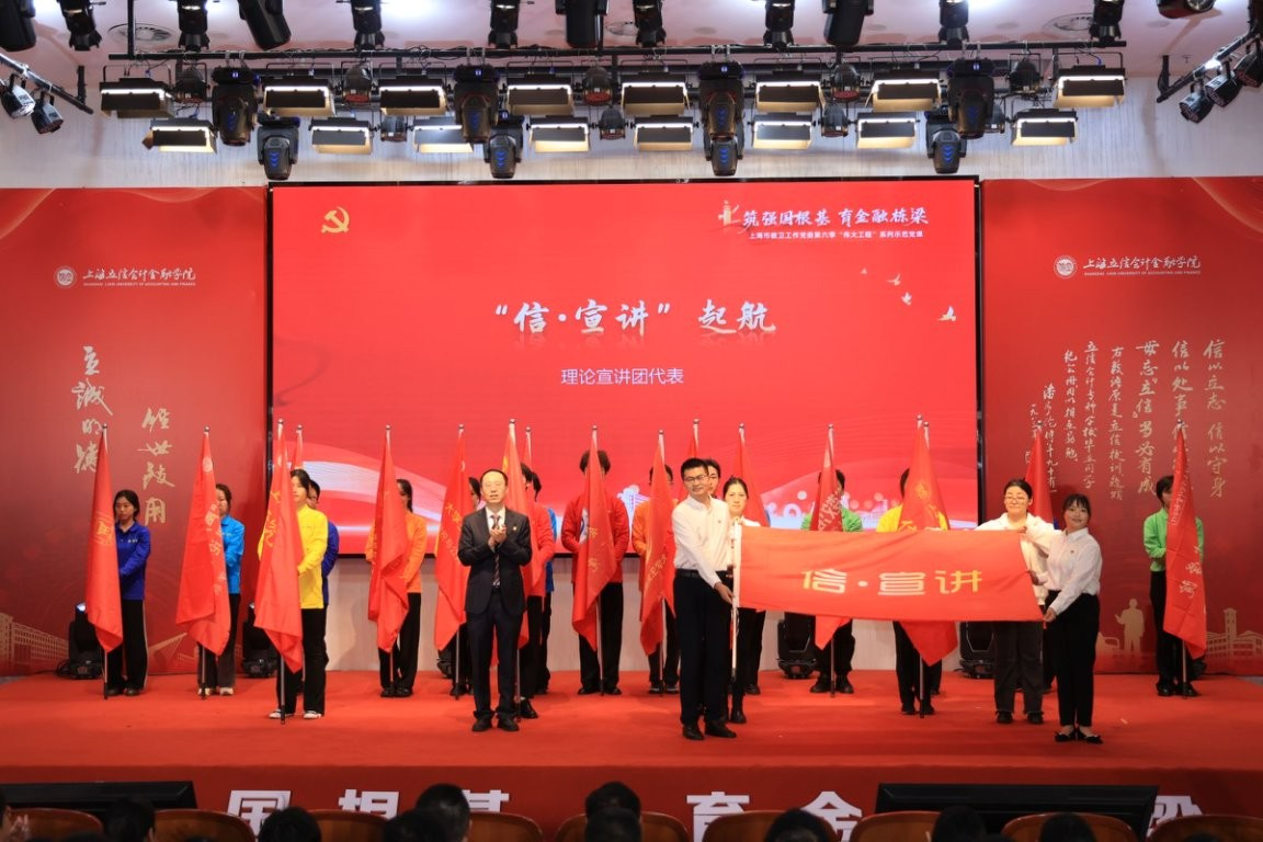 示范党课上,“信·宣讲”正式启航。党委副书记尹晨向“信·宣讲”主题活动代表授旗。教师代表以朗诵形式,再现了立信教师在学生党建、学科建设、科创竞赛、教书育人等领域默默耕耘的场景。原创歌曲《诚信铸未来》再度诠释了“信以立志、信以守身、信以处事、信以待人、毋忘‘立信’、当必有成”的当代实践。