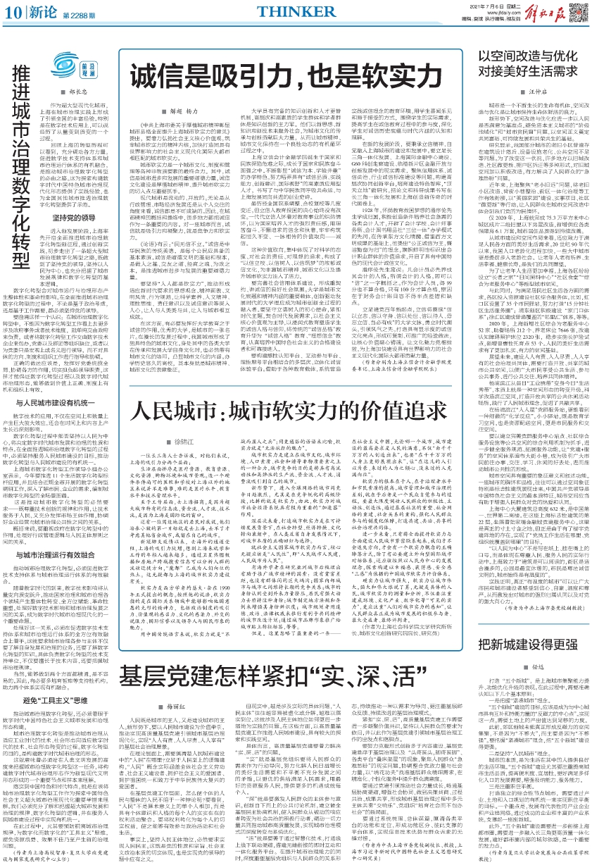 要坚持“人人都是软实力”,推动形成适应新时代要求的思想观念、精神面貌、文明风尚、行为规范,让科学素养、人文精神、理性思维、责任意识以及诚信意识等深入人心,让人与人美美与共,让人与城市相互成就。