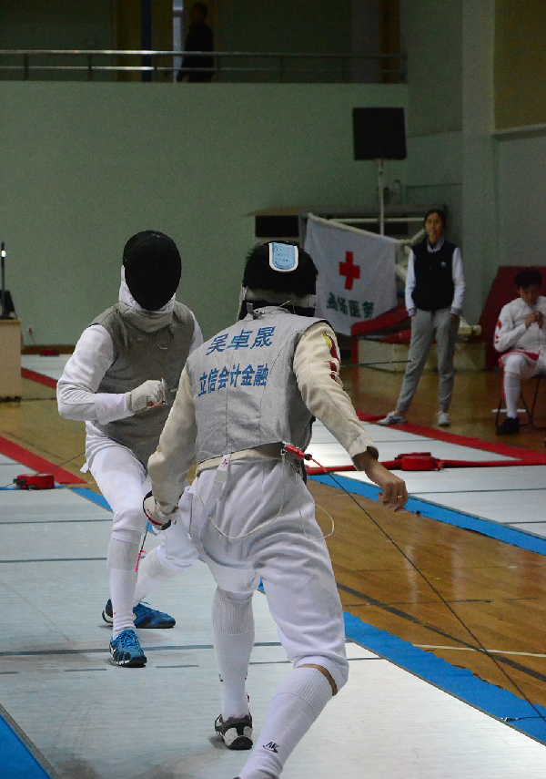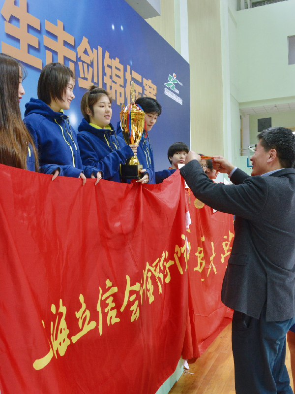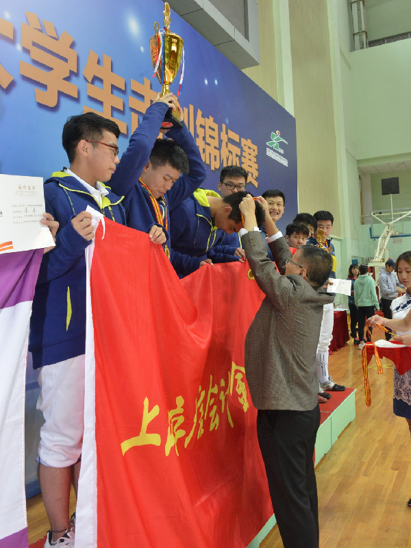 代表上海立信会计金融学院参赛的队员董力吸引了大批粉丝前来观战,将比赛气氛推至高潮。董力在赛场上的表现也十分抢眼,最终与三名队友共同拿下丙组男子花剑团体冠军。