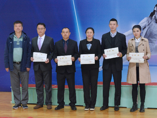 上海立信会计金融学院党委书记李世平、副校长赵荣善为本届大赛获奖的运动员颁奖。