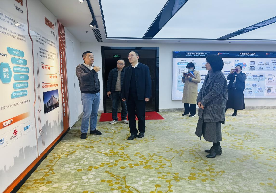 尹晨一行首先参观了上海欣诺通信的企业展厅与研发中心,实地观摩了公司在光网络设备、数据通信、网络安全专用设备等领域的核心产品与技术成果,详细了解企业的生产测试流程、空间规划布局、核心设备配置及市场化运营机制,并就AI算法应用、技术研发团队建设、数智审计等问题与企业技术骨干进行现场交流。