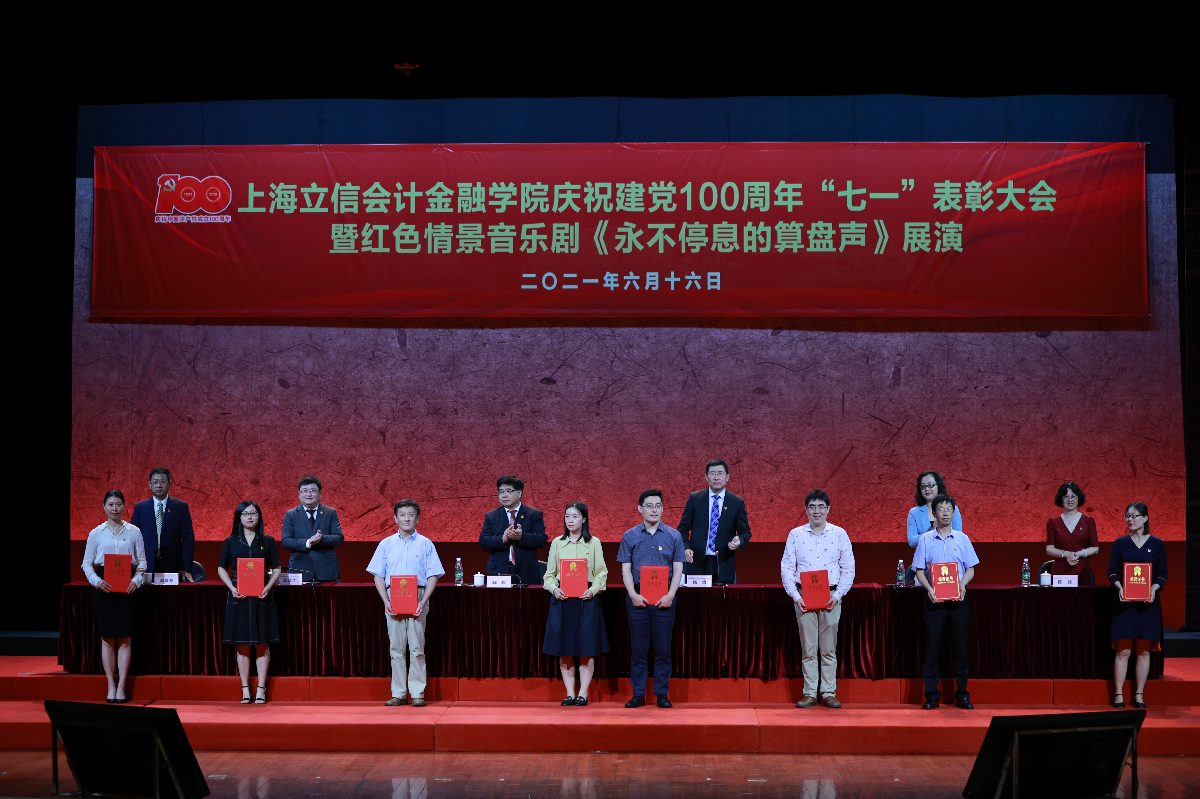 6月16日下午,我校在松江校区昭信堂举行“庆祝建党100周年‘七一’表彰大会暨红色情景剧《永不停息的算盘声》展演”活动。校领导班子成员、中层干部、组织员、党支部书记、教工和学生代表,以及被表彰的优秀个人和先进集体等参加活动。表彰大会由党委副书记、校长杨力主持。