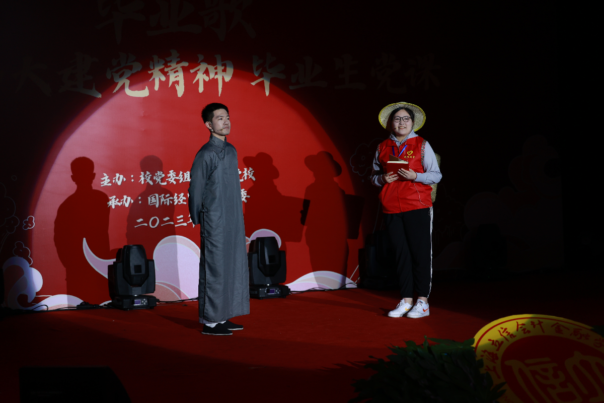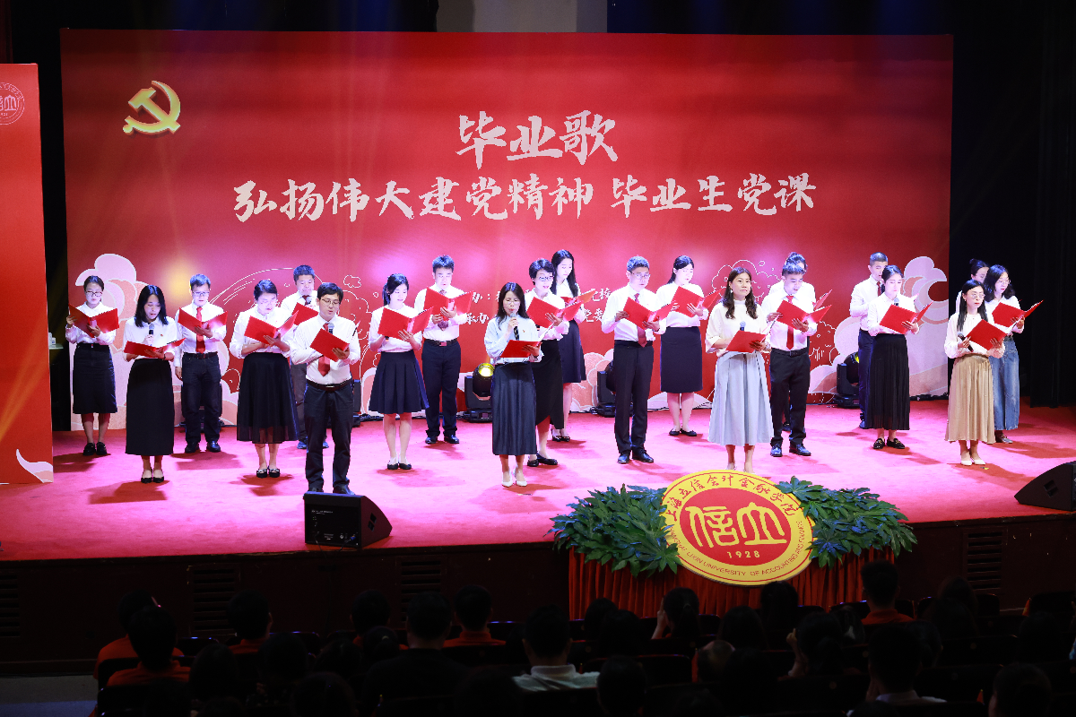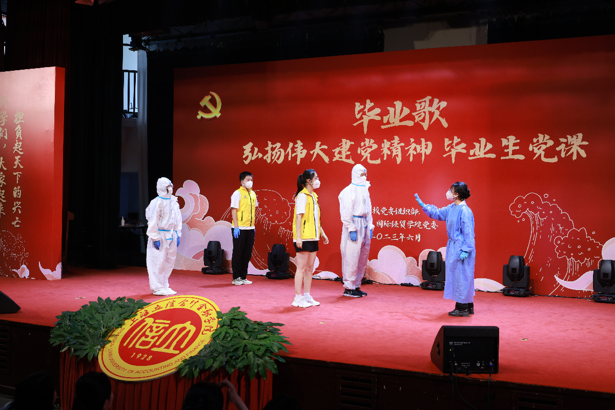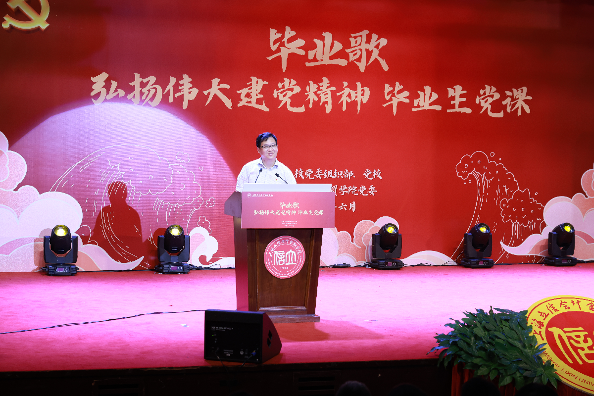 为弘扬伟大建党精神,进一步丰富毕业生党员教育形式,在“七一”党的生日即将来临之际,6月14日下午,由校党委组织部、党校主办,国际经贸学院党委承办的“毕业歌-弘扬伟大建党精神”毕业生党课在上川路校区小剧场开讲。校党委副书记、副院长王军华,党委常委、副院长赵荣善,党委常委、党委组织部长刘永琴出席。相关职能部门负责人,上川路校区各二级学院党组织负责人和专职组织员、毕业生党员、入党积极分子代表等700余人观看了本次党课。