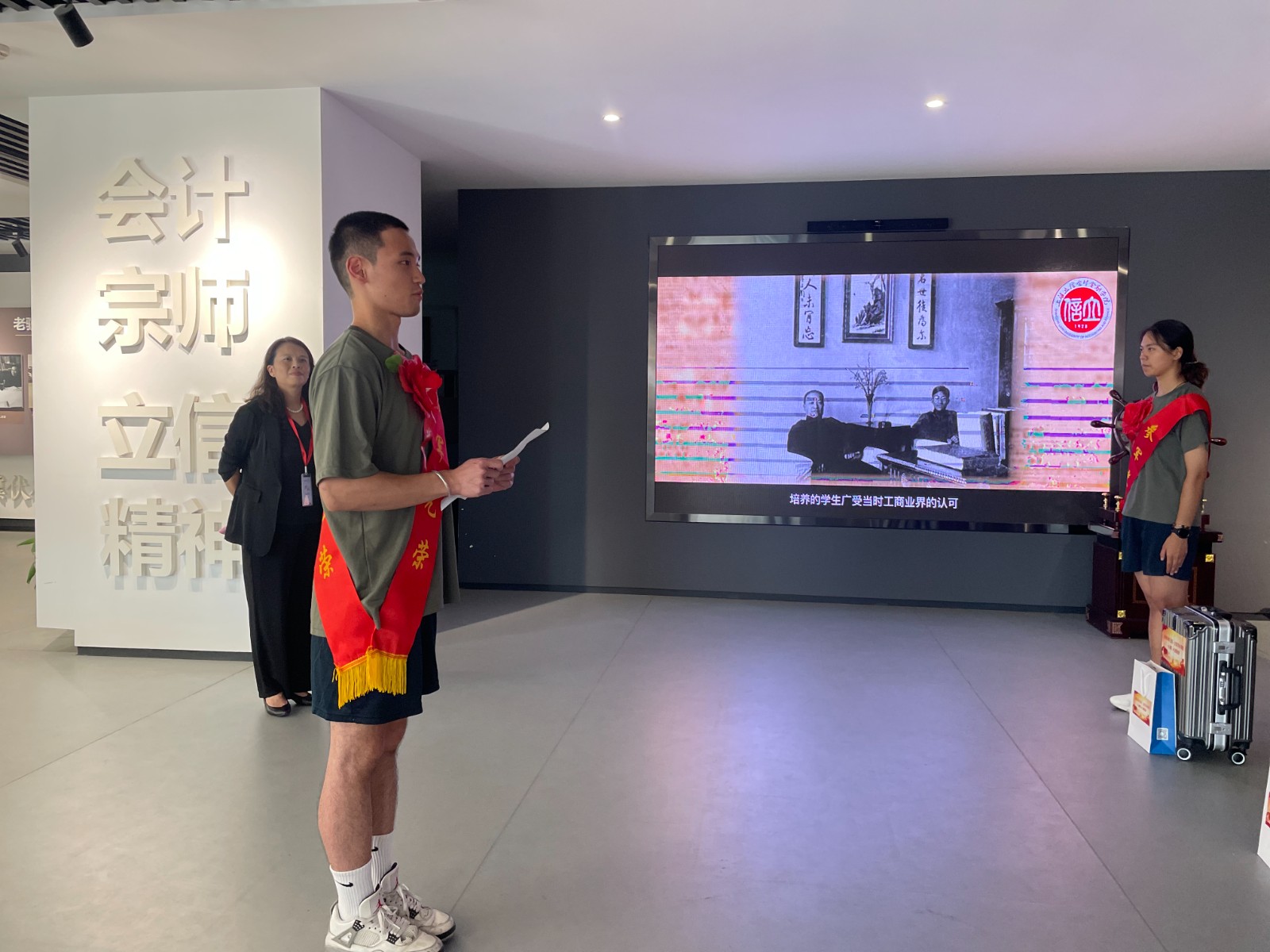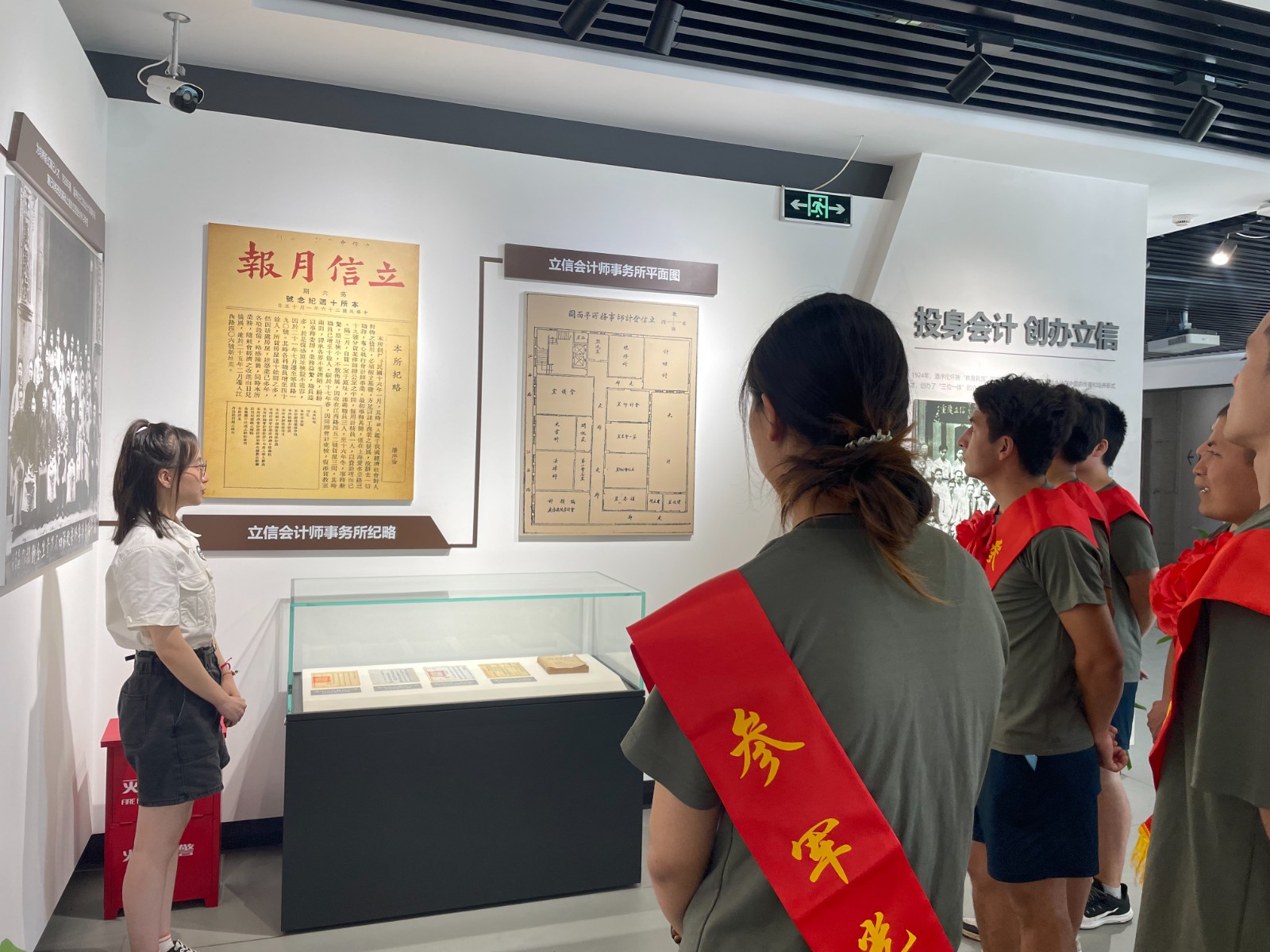仪式后,党委武装部组织预定新兵参观校史馆,讲解员带领大家重温校史,再次感受立信精神的传承发展,为预定新兵上好一堂“行前思政课”。“行前思政课”由党委武装部于2023年3月创设,旨在加强学生入伍前教育,引导学生到部队后继续秉持“立信”校训,发扬“立诚明德,经世致用”的大学精神,刻苦训练、勇于奉献、争创佳绩。