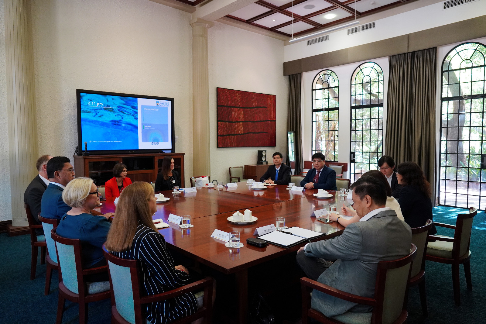 在访问西澳大学期间,代表团一行与西澳大学校长Amit Chakma、副校长Jennifer Howell和商学院相关负责人等进行了会谈。西澳大学是澳大利亚八校联盟成员之一,2024QS世界大学排名第72位,已培养了100多名罗兹学术奖得主和诺贝尔奖得主。Amit Chakma对远道而来的立信代表团表示热烈欢迎,他指出,西澳大学非常期待与立信在人才培养、联合科研和合作办学等方面加强交流,深化合作。解超回顾了两校近10年的合作历程及合作成效,提出两校共建中外合作办学机构的设想。他表示,在今年8月中国教育部部长怀进鹏访问澳大利亚时,双方高度肯定了深化中澳教育领域务实合作的重要性,此次访问正是对此共识的积极实践,两国间友好的战略伙伴关系为双方开启中澳高校的进一步合作奠定了坚实基础。西澳大学对解超的提议积极回应,表示明年3月将赴上海访问我校并继续探讨中外合作办学机构事宜,深化两校合作。