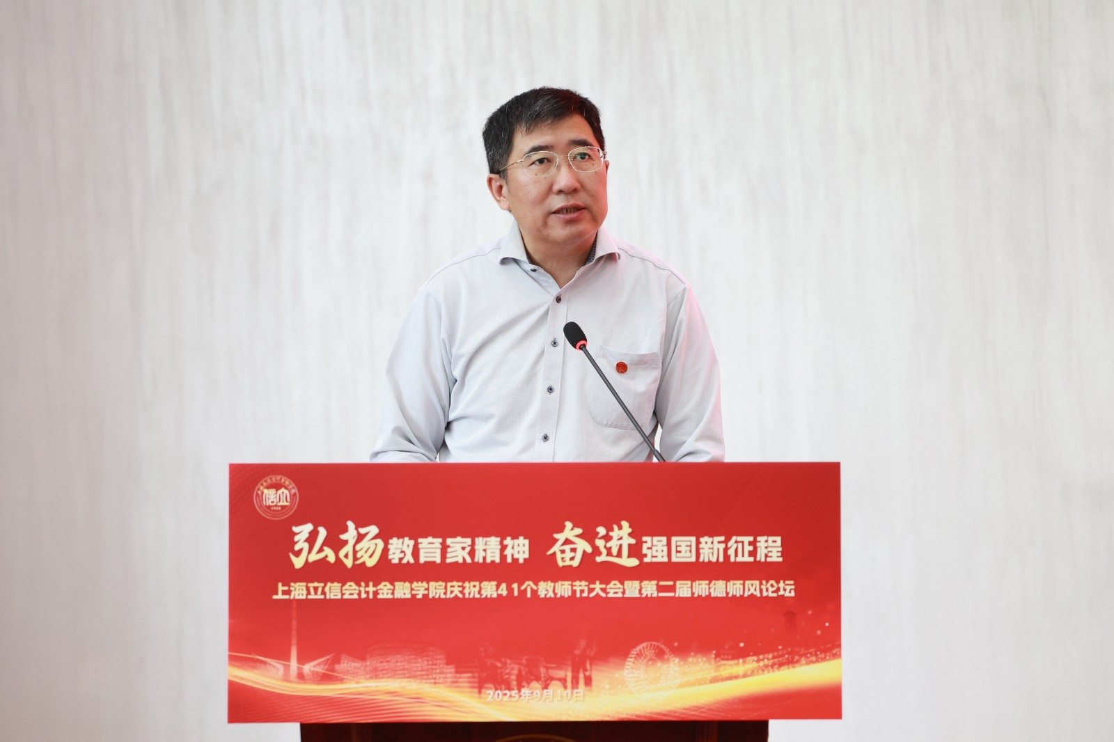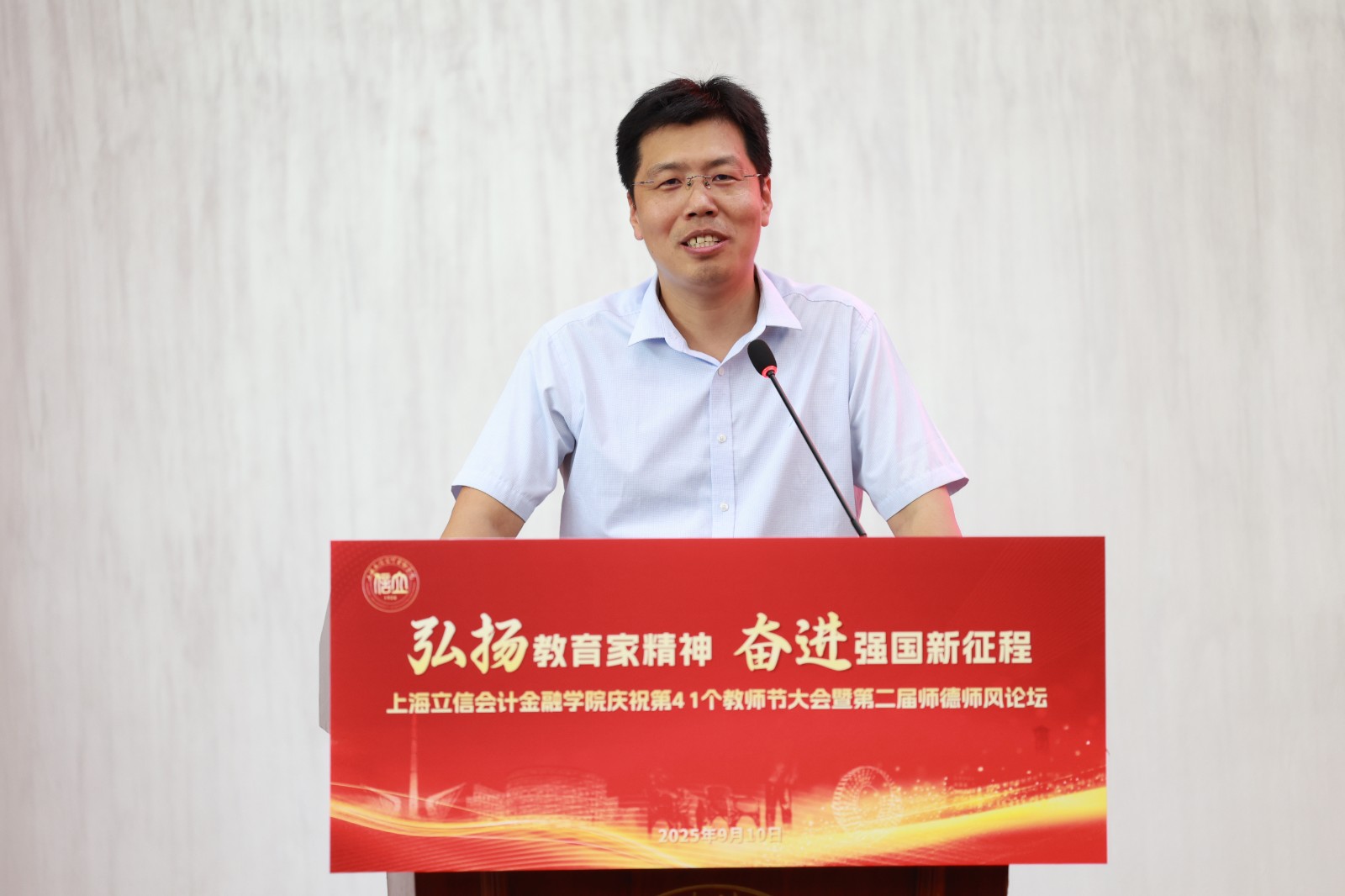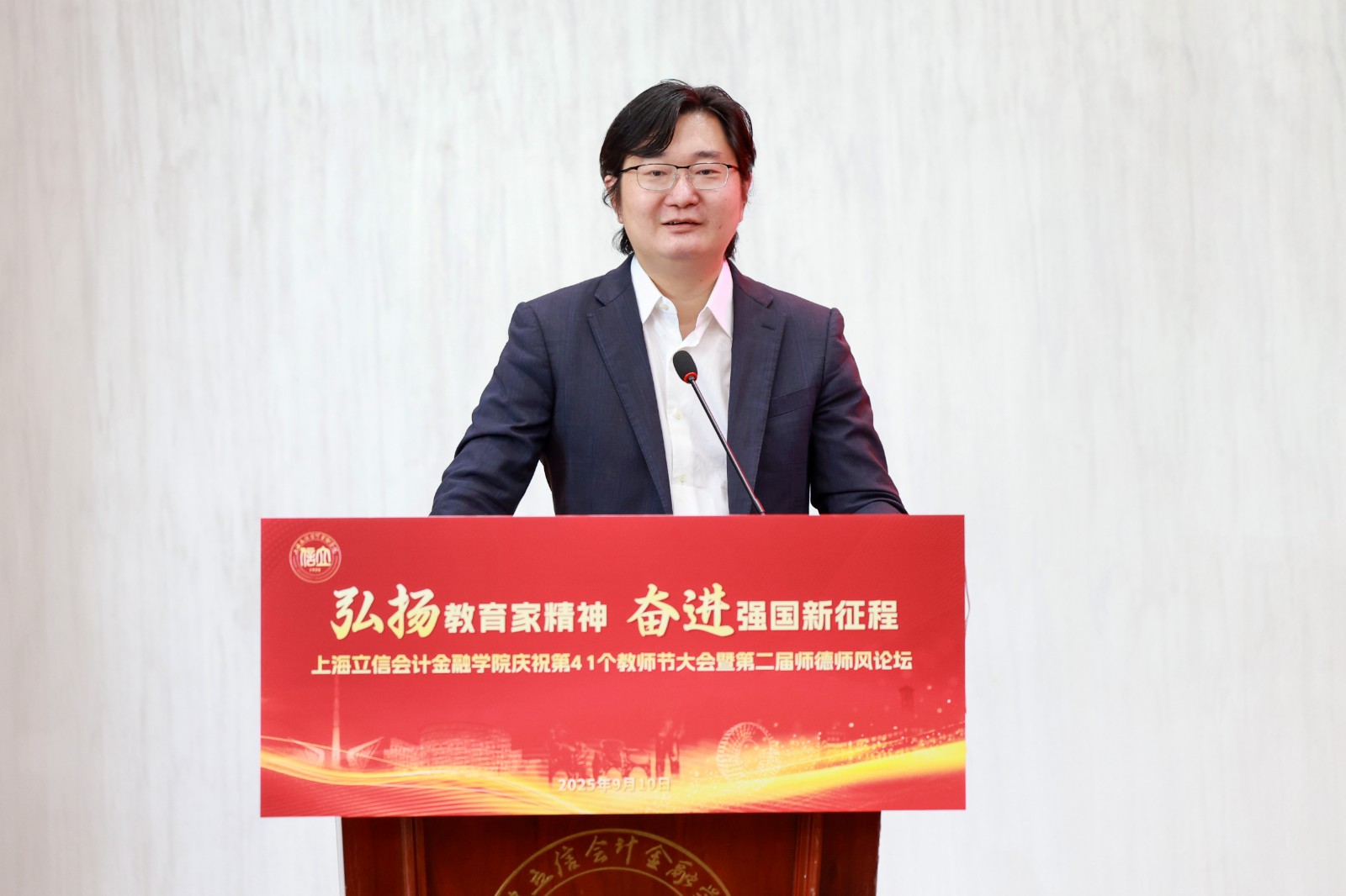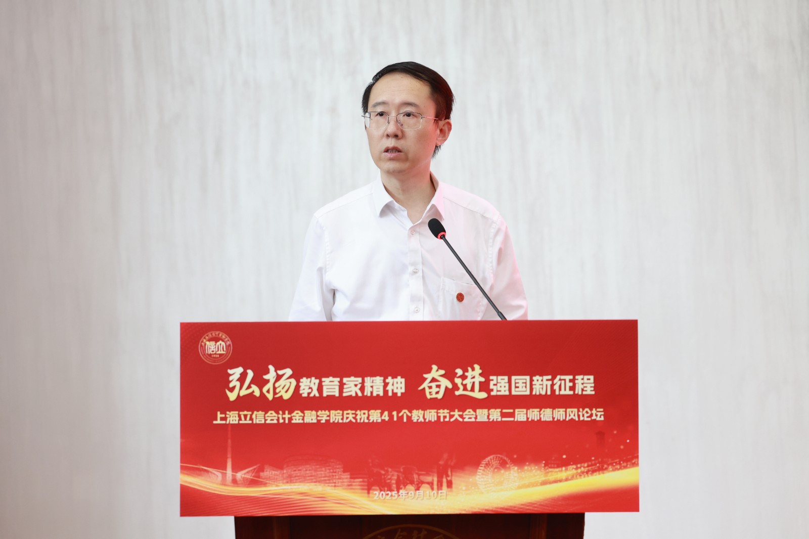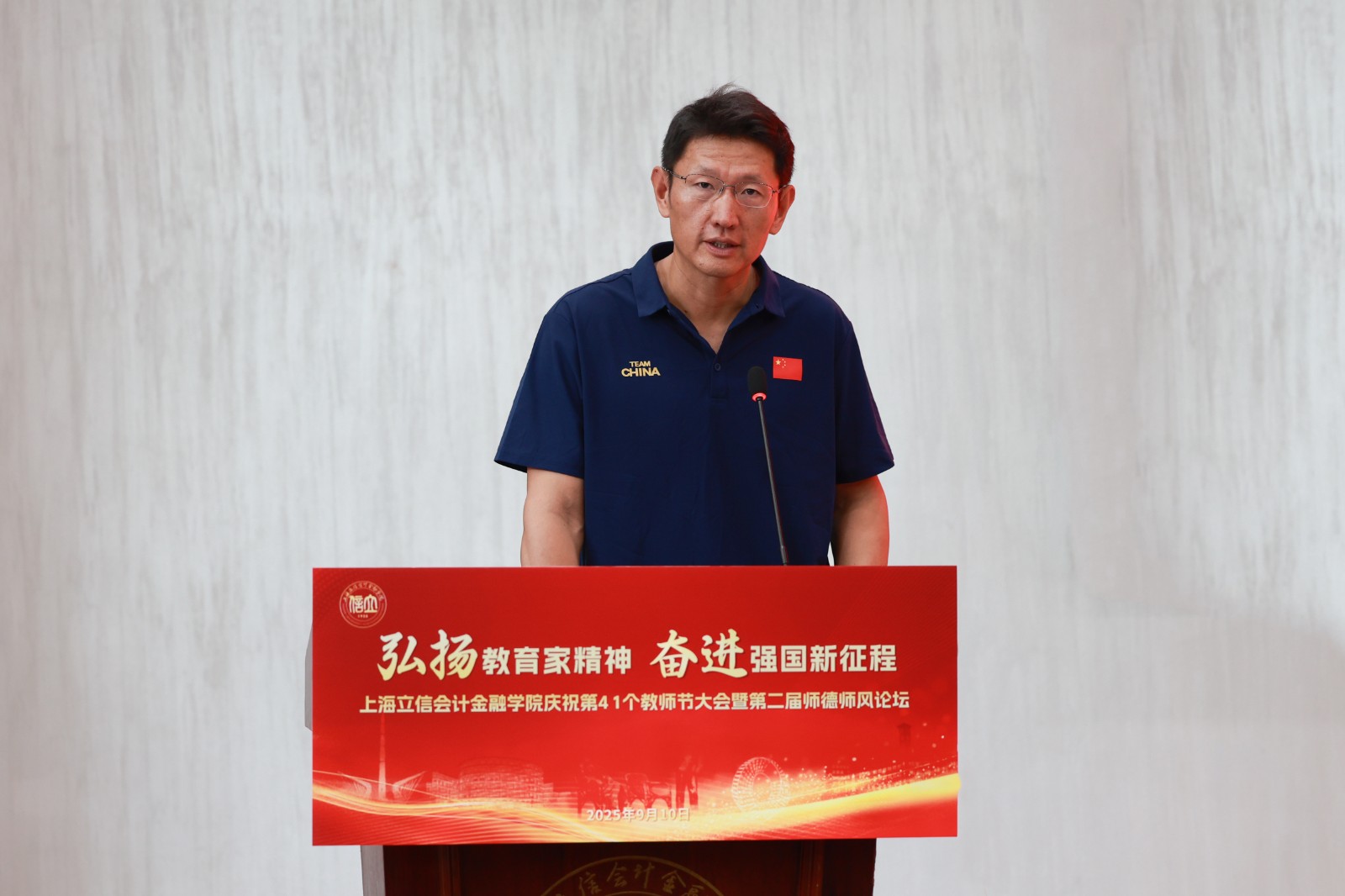 师德师风论坛上,高层次人才项目入选者、会计学院院长李培功教授,2024年校教学名师陈瑜教授,2022-2023年度校师德标兵何翌老师,2024-2025年度校师德标兵徐鑫副教授,上海高校辅导员工作室主持人年大琦副教授分别以“弘扬教育家精神,以有组织的科研助力学校事业高质量发展”“躬耕教坛,做学生成长的引路人与同行者”“以爱为桨+用心育人=师生并肩、奋楫前行——一名体育老师的幸福公式”“扎根立信,面向未来:我的师德观与育人实践”“以信仰为基,守教育初心——在传承创新中书写新时代育人答卷”为题,分享关于科研助力高质量发展、产教融合、以体育人、师德传承、红色基因铸魂等方面的育人智慧,生动展示了新时代立信教师的爱生情怀和教育坚守。