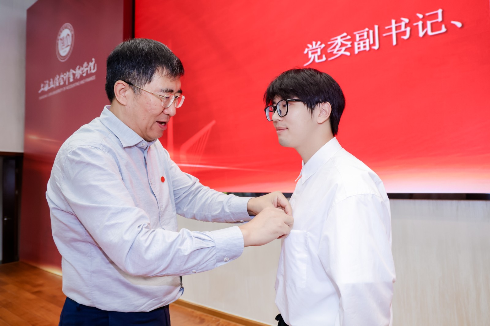 杨力为新生代表佩戴校徽,勉励新生传承学校近百年积淀的学术精神和诚信理念。