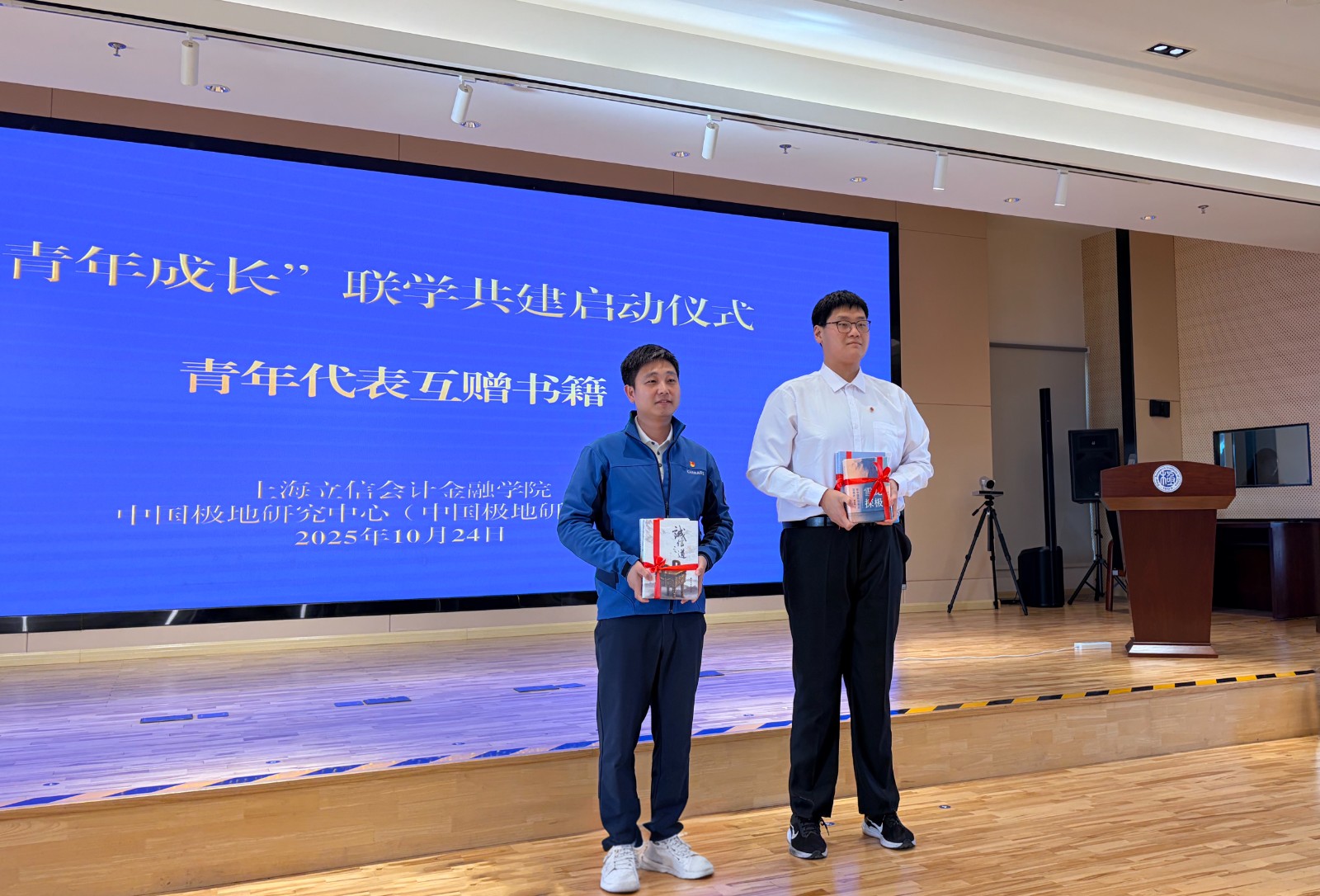 在“青年成长”联学共建活动中,双方青年代表互赠首批成长阅读图书,共建“青年成长读书角”,搭建青年师生与科研工作者共学共进的精神家园。学校“新进社”三位学生代表结合自身专业,分享了对南极精神和科学家精神的理解,表达了传承红色基因、勇担强国使命的坚定信念。