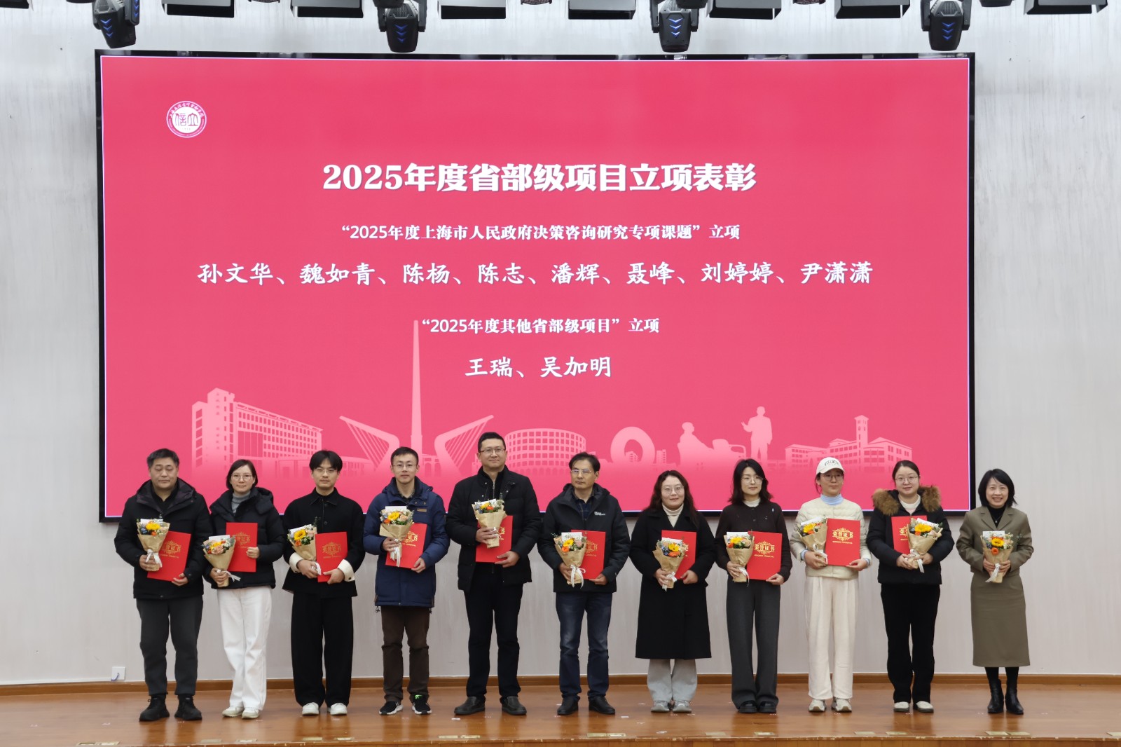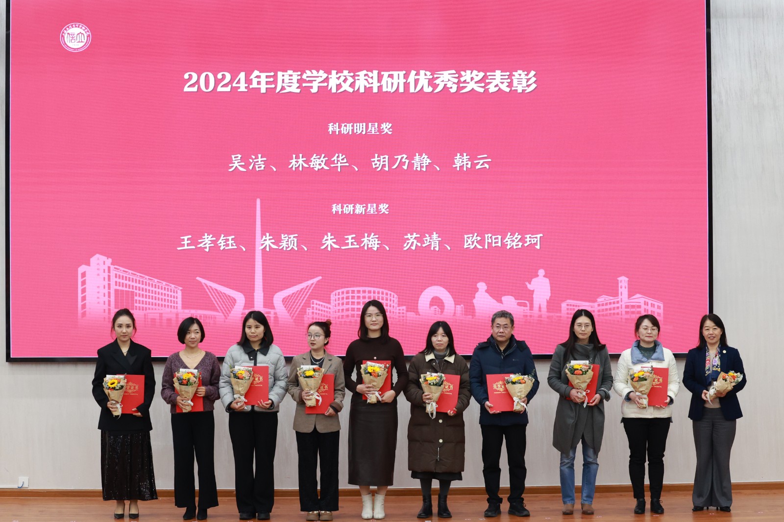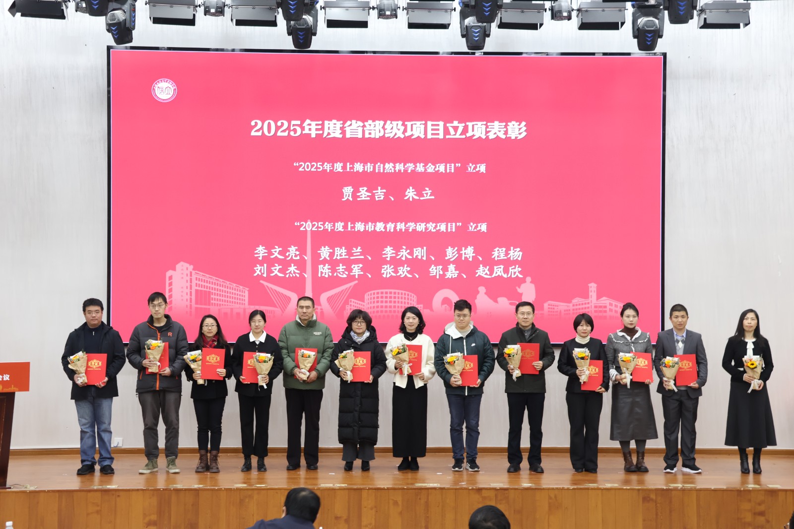 在表彰环节,2025年省部级科研奖项获奖团队代表、2024年度学校科研优秀奖获得者、2025年度国家级项目立项负责人、2025年度省部级项目立项负责人等接受表彰和师生代表献花致礼。