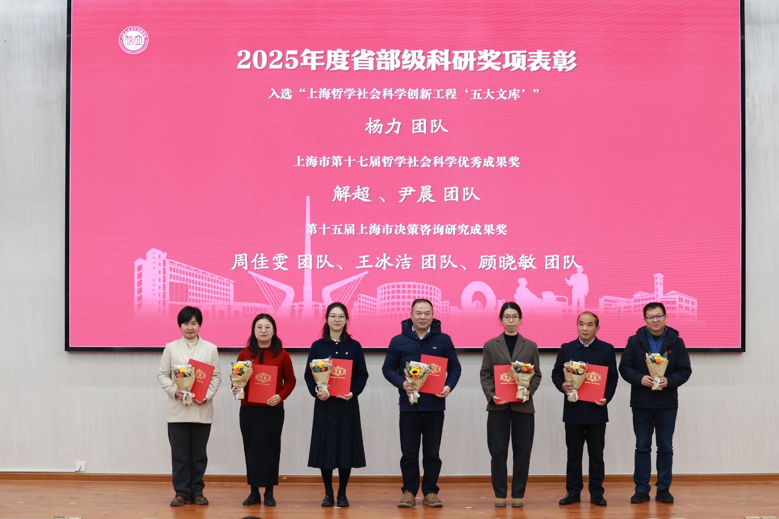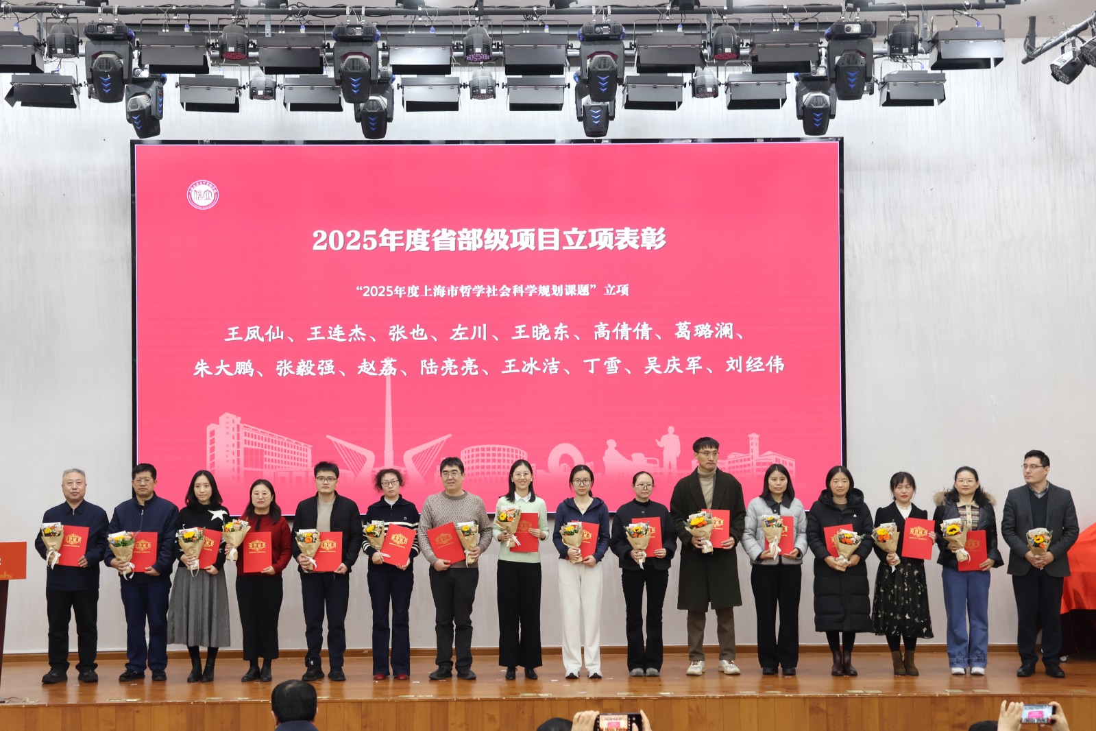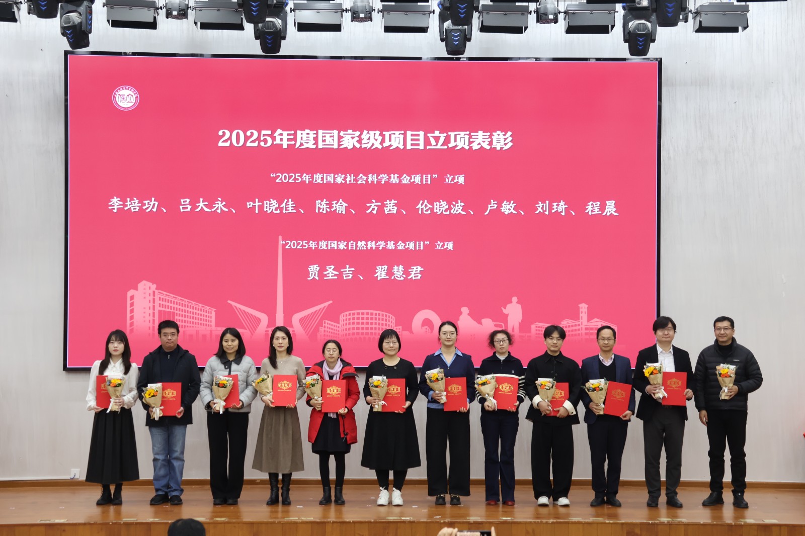 在表彰环节,2025年省部级科研奖项获奖团队代表、2024年度学校科研优秀奖获得者、2025年度国家级项目立项负责人、2025年度省部级项目立项负责人等接受表彰和师生代表献花致礼。