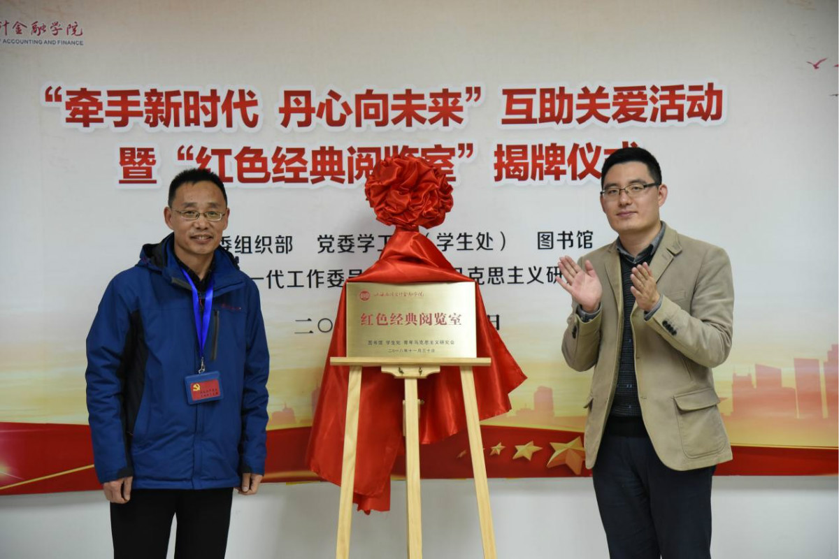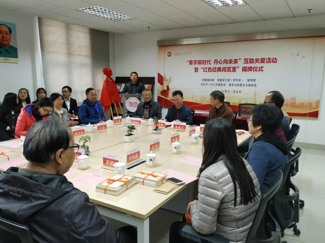 12月5日下午,由校党委组织部、党委学工部、图书馆、关心下一代工作委员会、青年马克思主义研究会主办的“牵手新时代丹心向未来”互助关爱活动暨“红色经典阅览室”揭牌仪式在浦东校区学生活动中心举行。校党委副书记、副校长王军华,副校长朱亚兵,校关心下一代工作委员会常务副主任鲁海波,组织部、学工部、关工委、宣传部、团委、图书馆、马克思主义学院及其他职能部门负责人、青年马克思主义研究会师生代表等40余人参加活动。会议由党委学工部副部长李政主持。