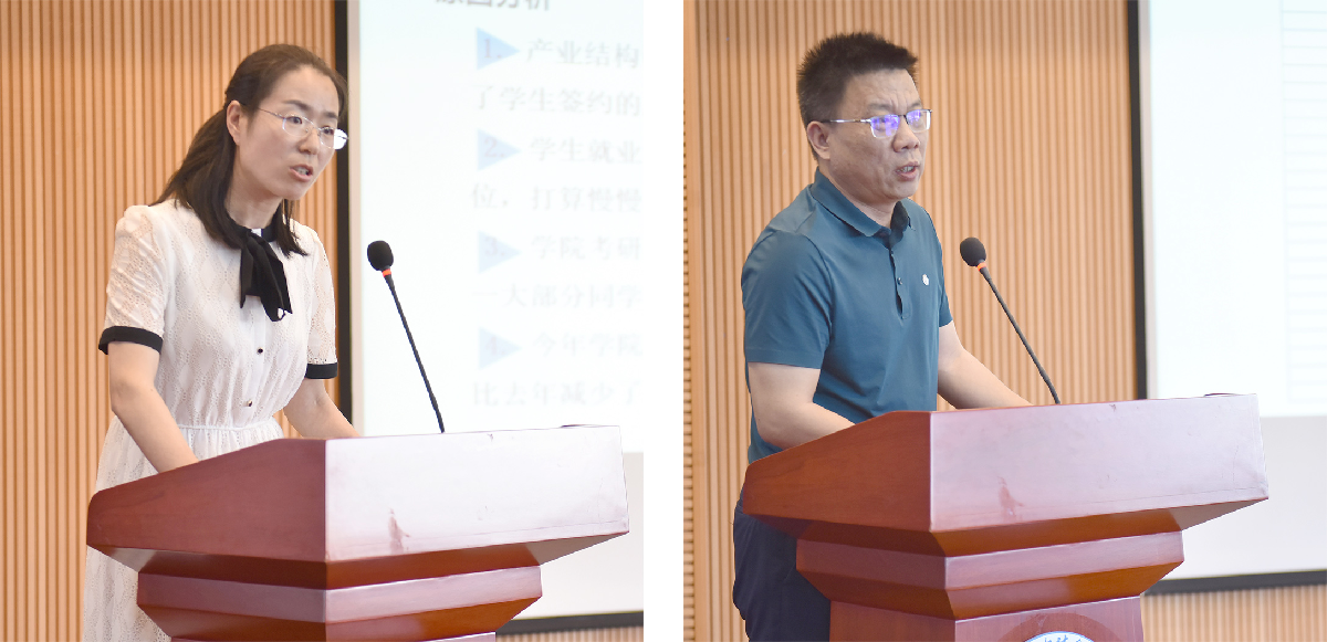 会上,金融学院党委副书记、院长许文新,国际经贸学院党总支书记程振强,财税与公共管理学院党总支副书记、副院长王亭,法学院党总支副书记、副院长徐利民作为学院代表发言,介绍了各学院在学生就业工作中的特色举措,对所面临的压力、困难和存在的不足进行了梳理分析。会计学院张群、工商管理学院姜明辉、统计与数学学院田美作为毕业班辅导员代表发言,分享了他们开展毕业生就业工作的具体做法和工作心得。