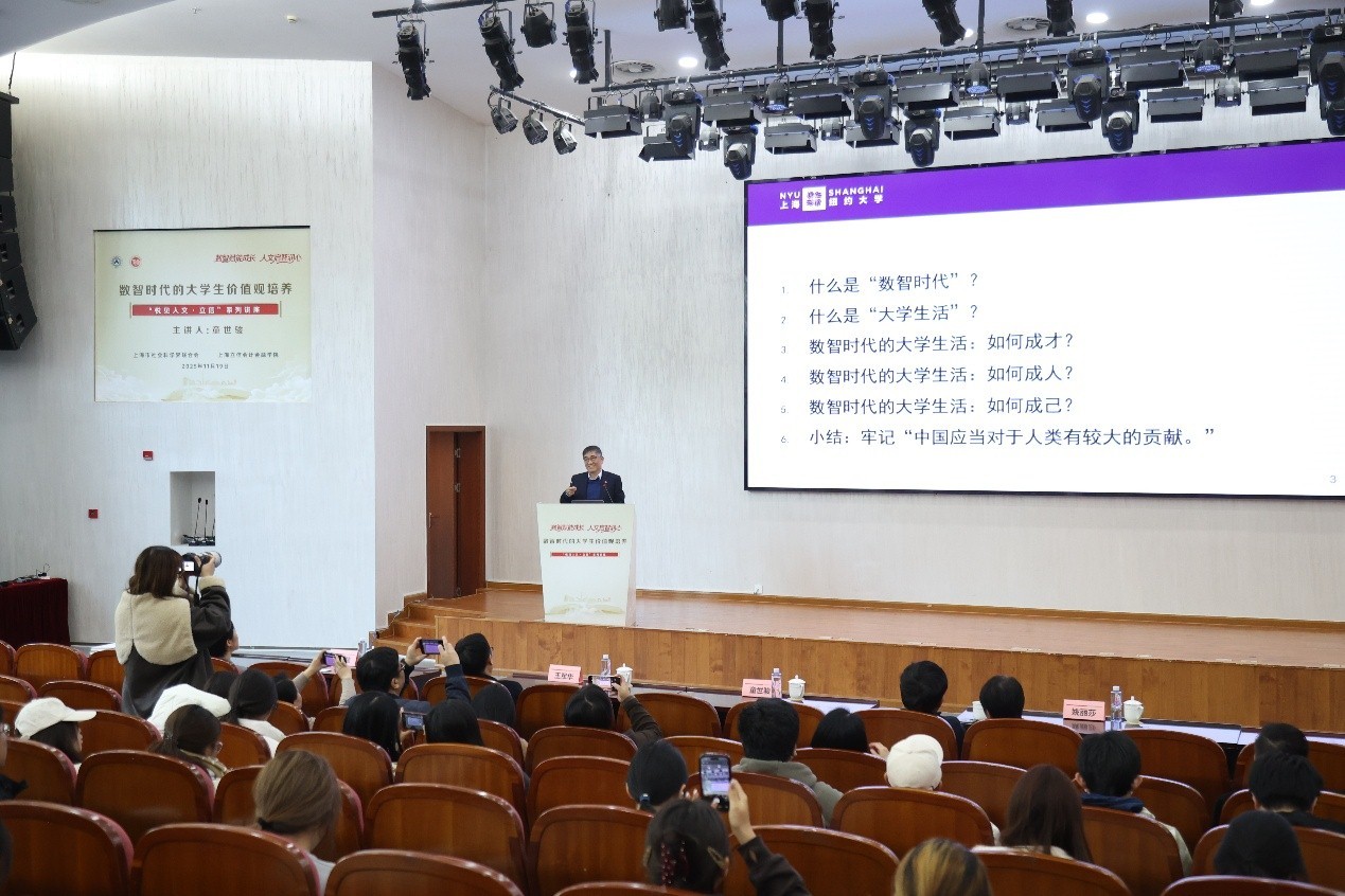 11月19日,由上海市社会科学界联合会与我校联合主办的“悦见人文·立信”系列讲座第二讲在上川路校区举行。本次讲座特邀上海纽约大学校长、华东师范大学哲学系教授童世骏主讲,校党委书记解超,校党委副书记、副院长王军华,市社联科普处处长姚丽莎,各二级学院学生工作负责人以及来自全校的500余名学生共同参与活动。讲座开始前,解超陪同童世骏参观了校史馆,详细介绍了学校的发展历程、办学特色。讲座由上海电视台资深新闻主播林牧茵主持。