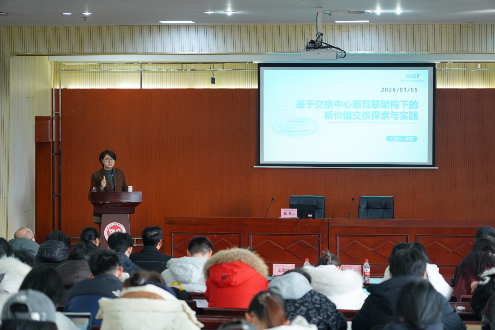 张茜以“基于交换中心新互联架构下的新价值交换探索与实践”为题作讲座。她详细介绍了全球及我国互联网交换网络的发展态势与结构特征,上海新型互联网交换中心在网络架构创新、业务模式拓展与服务生态构建方面的探索与实践以及上海在“算力出海”方面的实施路径。互动环节,张茜与现场师生围绕算力竞争力、如何更好帮助算力出海等问题进行交流。