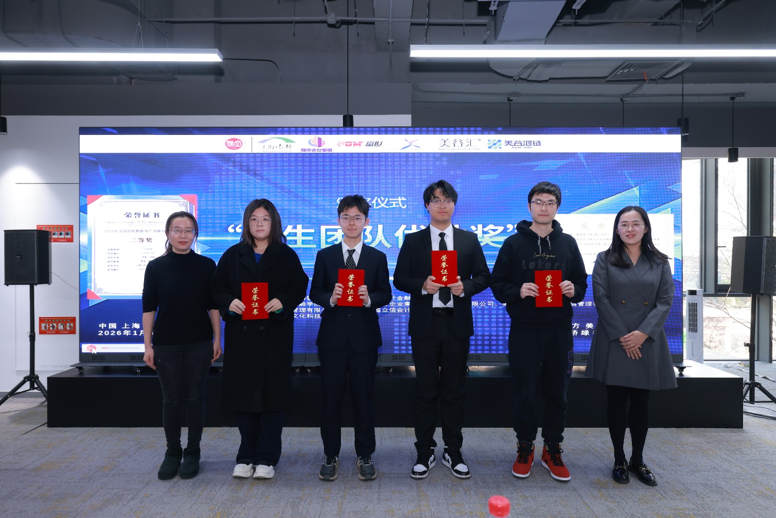校企双方共同为“数据资产创新实验中心”聘任的企业实务导师和校内学术导师颁发聘书。活动中还对在2025年全国高校数据资产创新应用大赛以及第五届数据资产交叉学科建设论坛中表现突出的学生团队予以表彰。