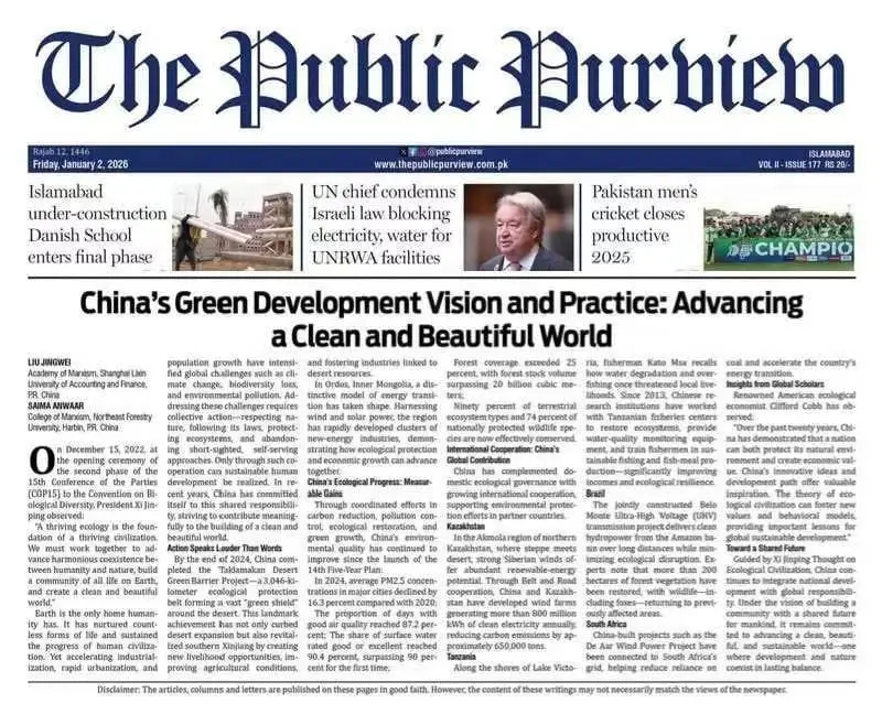 近日,马克思主义学院院长刘经伟教授在巴基斯坦《公众观察日报》(Daily The Public Purview Newspaper)发表文章《中国的绿色发展宣言与实践——推动清洁美丽世界建设》,阐述了中国生态文明建设的非凡成就,引发当地社会良好反响。