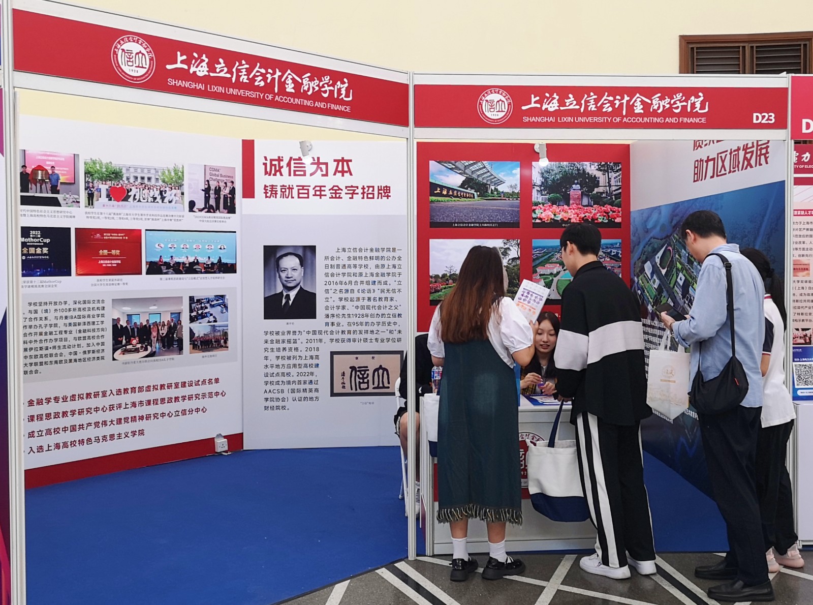 本届教博会我校展位以“赓续立信文脉 助力区域发展”为主题,按照“诚信为本 铸就百年金字招牌”“应用筑基 加快学校改革发展”“校地融合 服务区域社会发展”三个篇章布局架构,展示学校建校95年来的育人理念、办学特色和高质量发展成果,诠释学校深度融入上海经济社会发展,不断提升服务区域发展的能级和水平,共创一流城市教育的使命和担当。教博会一开展,我校展位就吸引了不少观众前来参观咨询,截至发稿前,我校展位人气值居高校版块第三位。