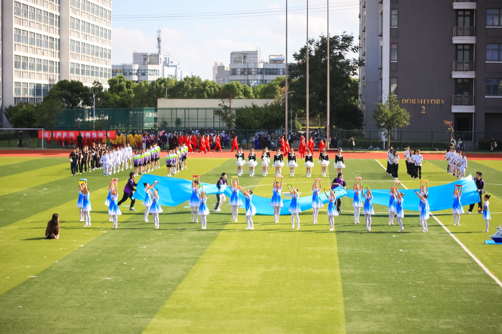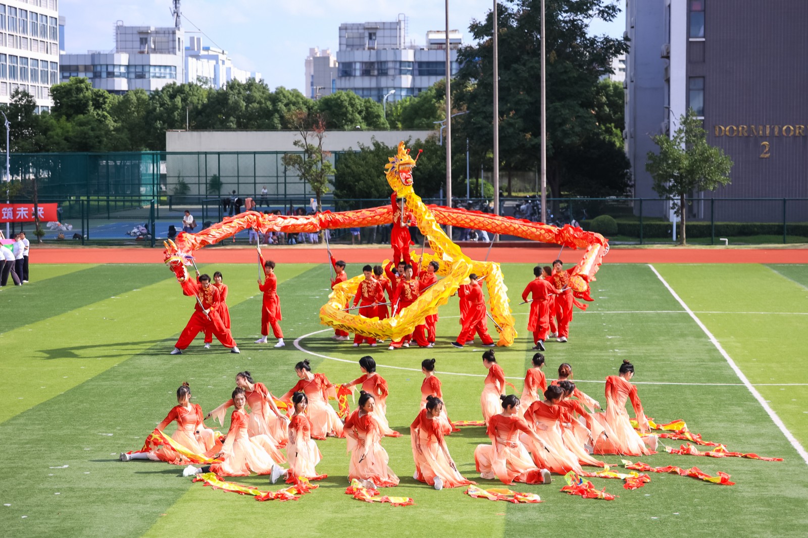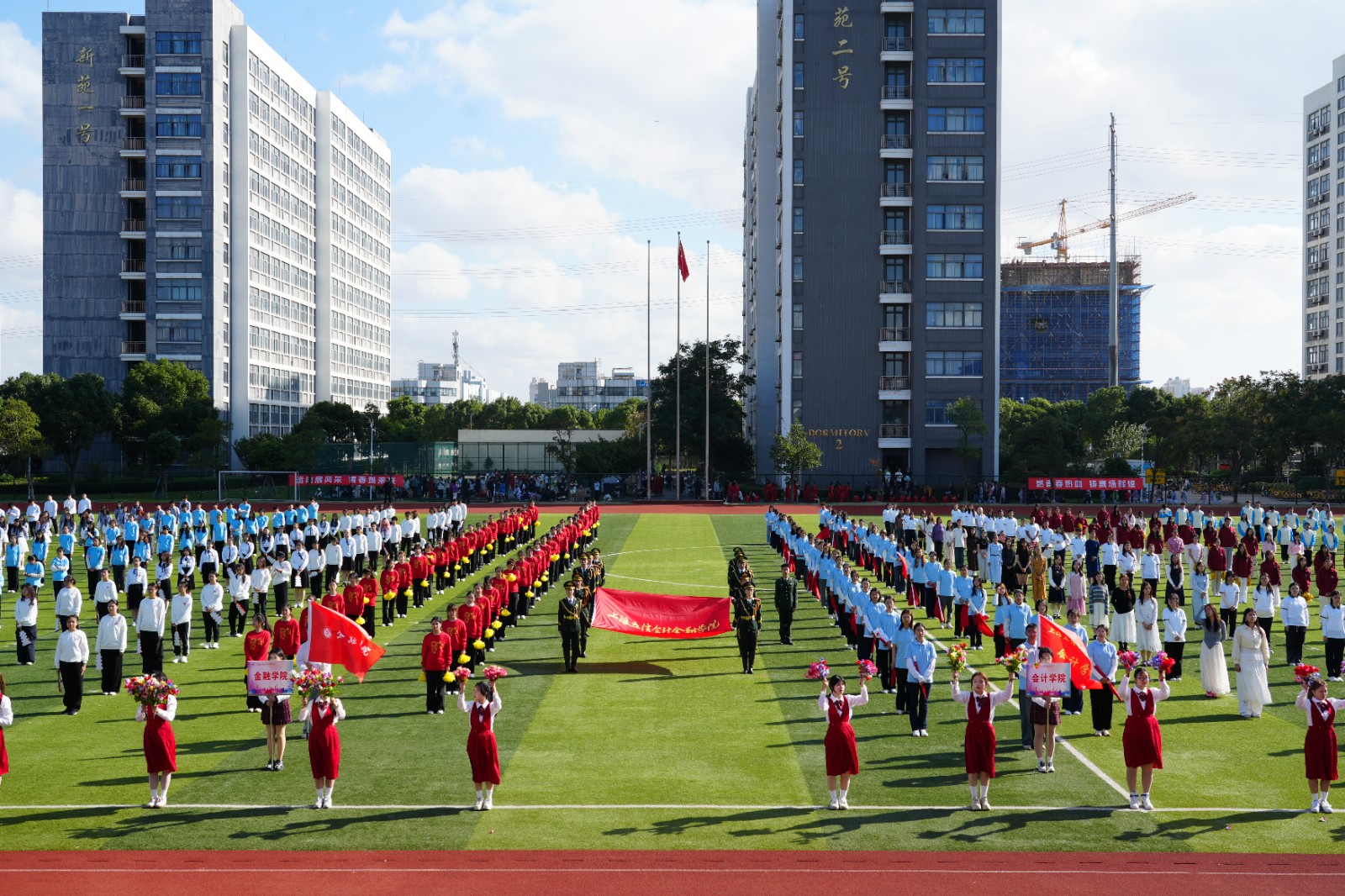开幕式上,伴随着激昂的旋律,国旗护卫队、校旗护卫队迈着铿锵有力的步伐率先入场,鲜花方阵、红旗方阵、各学院学生代表队、留学生代表队及教工代表队方阵依次通过主席台。校星海艺术团舞蹈团《奔跑的青春》惊艳开场,掀起青春热浪。立信附属学校学生舞蹈团《梦远航》以流畅有力的舞姿诠释执着信念。校阳光体育社团《运动华章》融合啦啦操与篮球、足球等多项运动项目元素,尽展体育之美。教职工太极拳社与流云武术社联袂演绎《中华传统养生功》,师生同台传承国粹。200名学生携手上海第二工业大学龙狮队上演《龙腾彩韵》以磅礴气势将开幕式推向高潮。