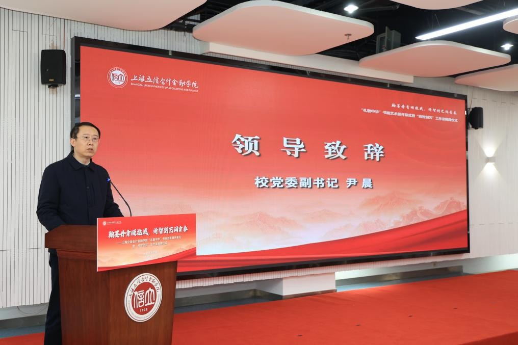 尹晨在致辞中指出,党的二十届四中全会明确提出要“发展具有强大思想引领力、精神凝聚力、价值感召力、国际影响力的新时代中国特色社会主义文化,扎实推进文化强国建设”。此次活动以书画为媒回望烽火岁月,既是对伟大抗战精神的致敬传承,也是落实文化育人要求的生动实践。他回顾了立信深厚的文化育人传统,从1936年开办的音乐训练班汇聚冼星海、吕骥等革命音乐家,诞生《黄河大合唱》《大刀进行曲》等经典抗战作品,到2013年首演、2025年复排的大师剧《潘序伦》,再到学校星海艺术团在全国大学生艺术展演中斩获的多项一等奖,以及书画协会成员超300人次在各级赛事中获奖,充分彰显了学校文化育人的丰硕成果。他强调,“绮智创艺”工作室是学校深化“五育并举”的重要举措,希望工作室坚守“以文化人、以美育人”初心,依托专业优势与校地资源,打造“一体一艺”人才培养的特色平台。他勉励师生坚定文化自信、厚植家国情怀,让抗战精神与中华优秀传统文化代代相传。