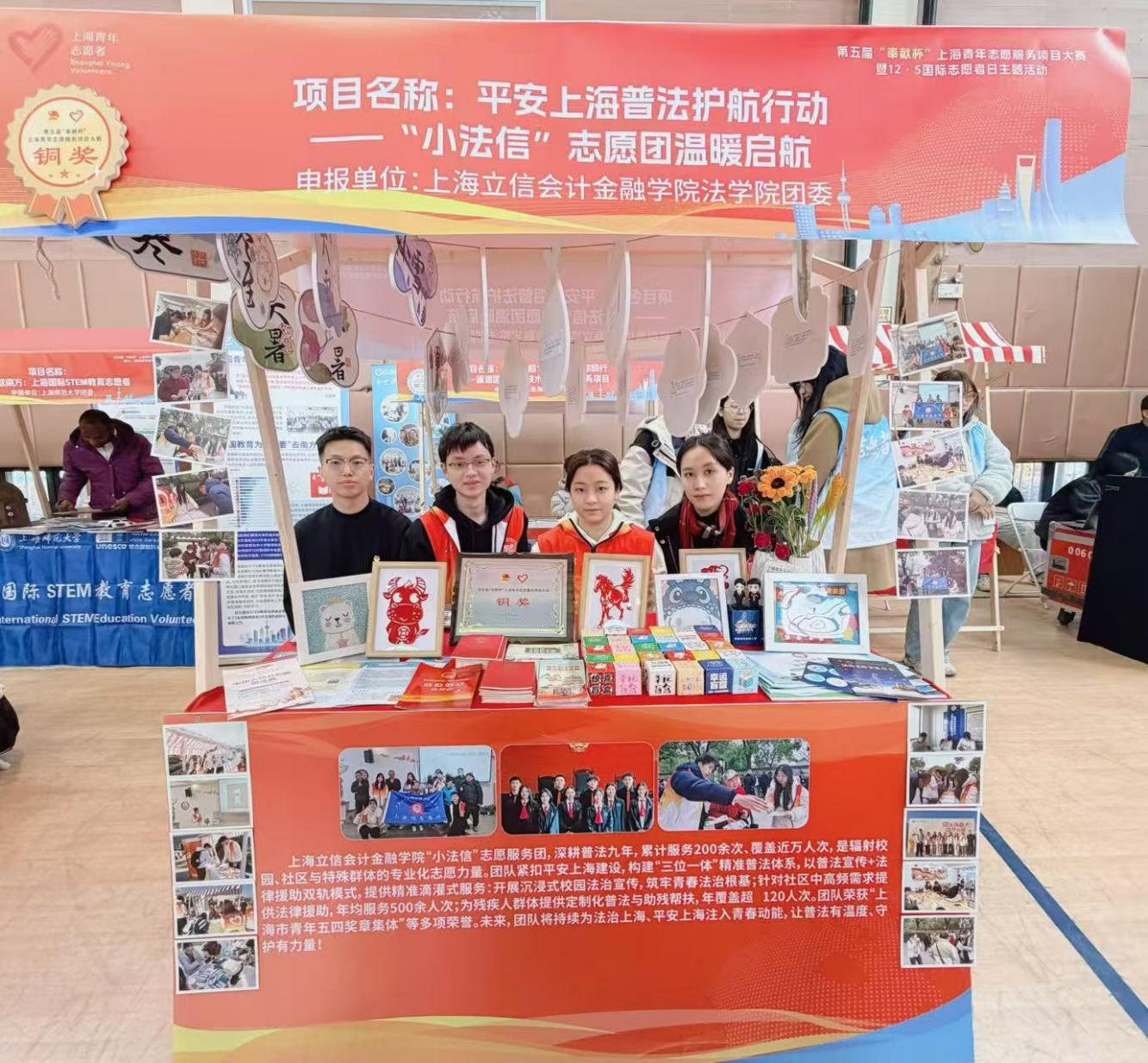 近日,由共青团上海市委员会、上海青年志愿者协会共同举办的第五届“奉献杯”上海青年志愿服务项目大赛落幕。我校法学院“平安上海普法护航行动——‘小法信’志愿服务团温暖启航”项目在全市300个项目中脱颖而出,荣获大赛铜奖。