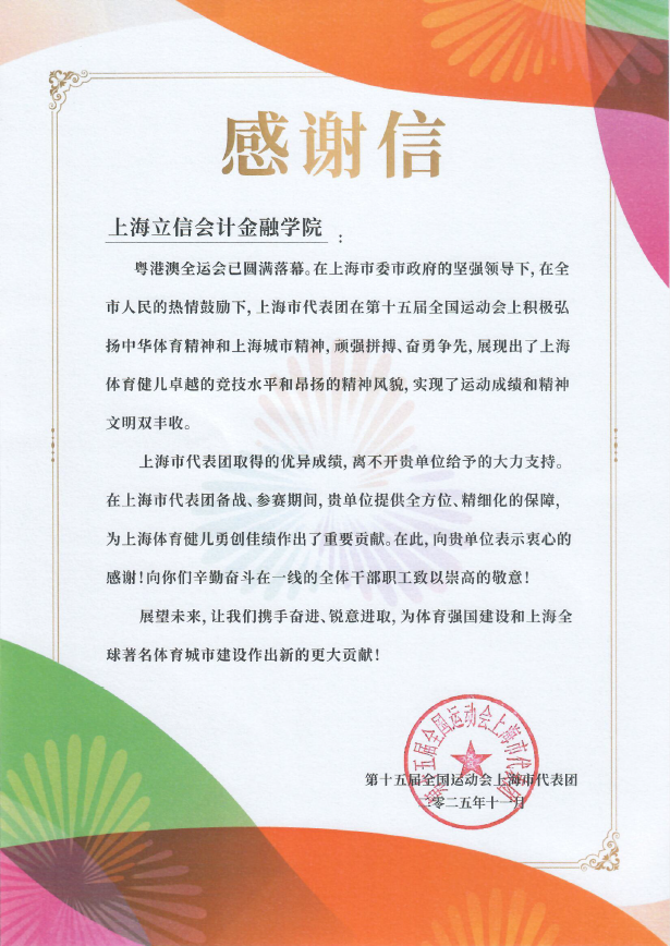 12月18日,第十五届全国运动会上海市总结大会在上海展览中心举行。市委书记陈吉宁,市委副书记、市长龚正,市人大常委会主任黄莉新,市政协主席胡文容等向在本届全运会中奋勇拼搏、载誉而归的上海体育健儿表示热烈祝贺和衷心感谢。我校市花剑队队员仇辰杰、陈奕宁、蔡金琿及教练员胡承安荣获“上海市体育事业贡献奖”并记功,副领队张振宇获表彰嘉奖。上海市代表团向我校发来感谢信,对我校为上海体育健儿勇创佳绩作出的重要贡献表示感谢。