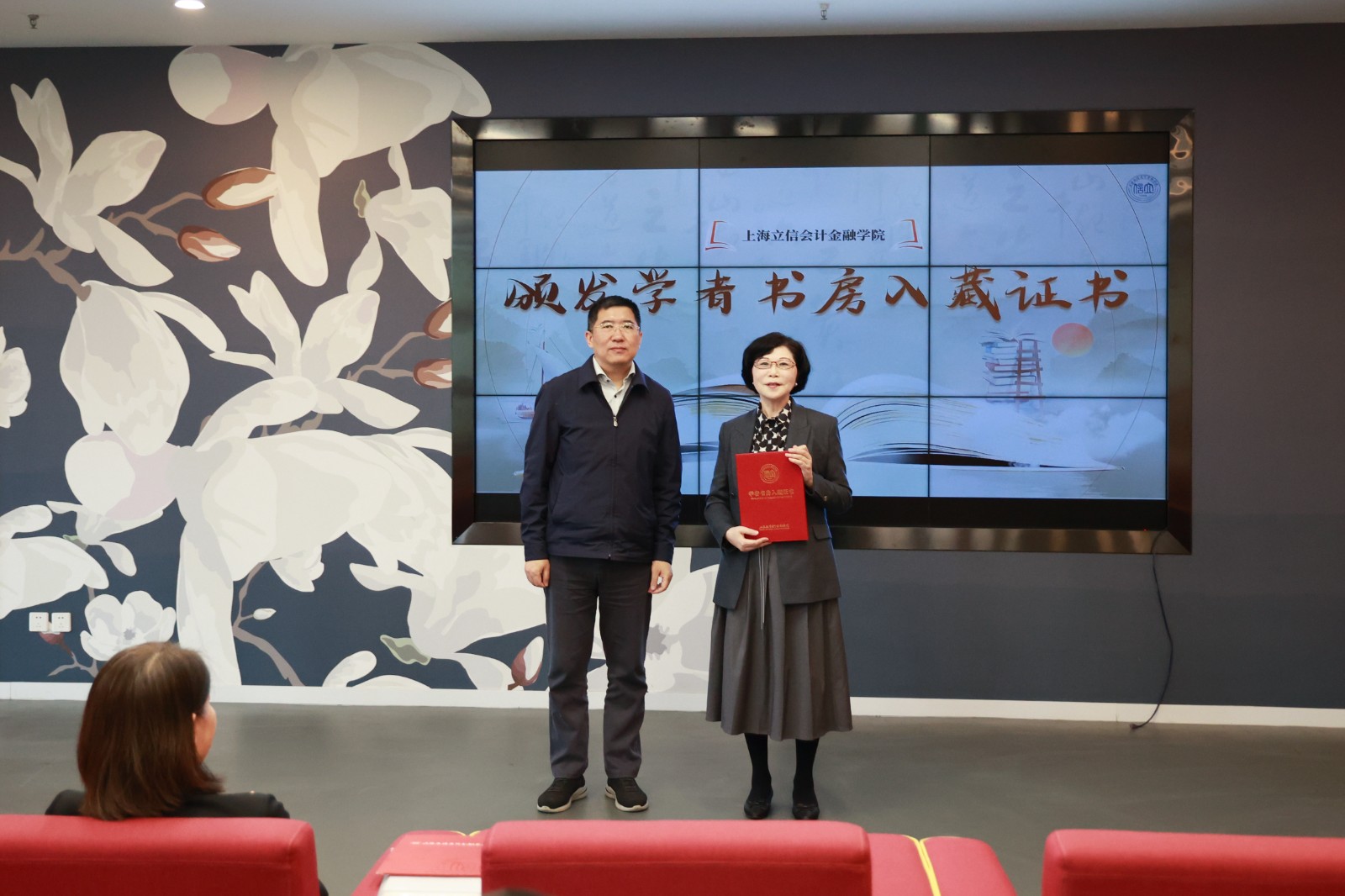 杨力为顾晓敏颁发了“学者书房”入藏证书,并为学校第25届假期阅读挑战赛获奖单位及学生团队代表颁奖。他在讲话中指出,阅读是传承文明、启迪智慧、涵养品格的重要途径,也是一所大学精神生长、文化积淀、内涵发展的根基。他强调,要进一步营造爱读书、读好书、善读书的校园风尚,并对全体师生提出三点希望:一是希望同学们以书为友,勤学笃行,在阅读中坚定理想信念、拓宽知识视野、锤炼专业本领,在书香中成长为有理想、敢担当、能吃苦、肯奋斗的新时代立信青年;二是希望老师们以书育人,言传身教,带头读书治学、潜心教研、提升本领,用自身的读书热情感染学生、引领学生,做学生阅读路上、成长路上的引路人;三是希望全校上下以书聚力,共建共享,持续丰富阅读活动、优化阅读空间、完善阅读服务,加强文献资源建设、提高读者服务质量,让阅读成为立信最鲜明的文化标识。
