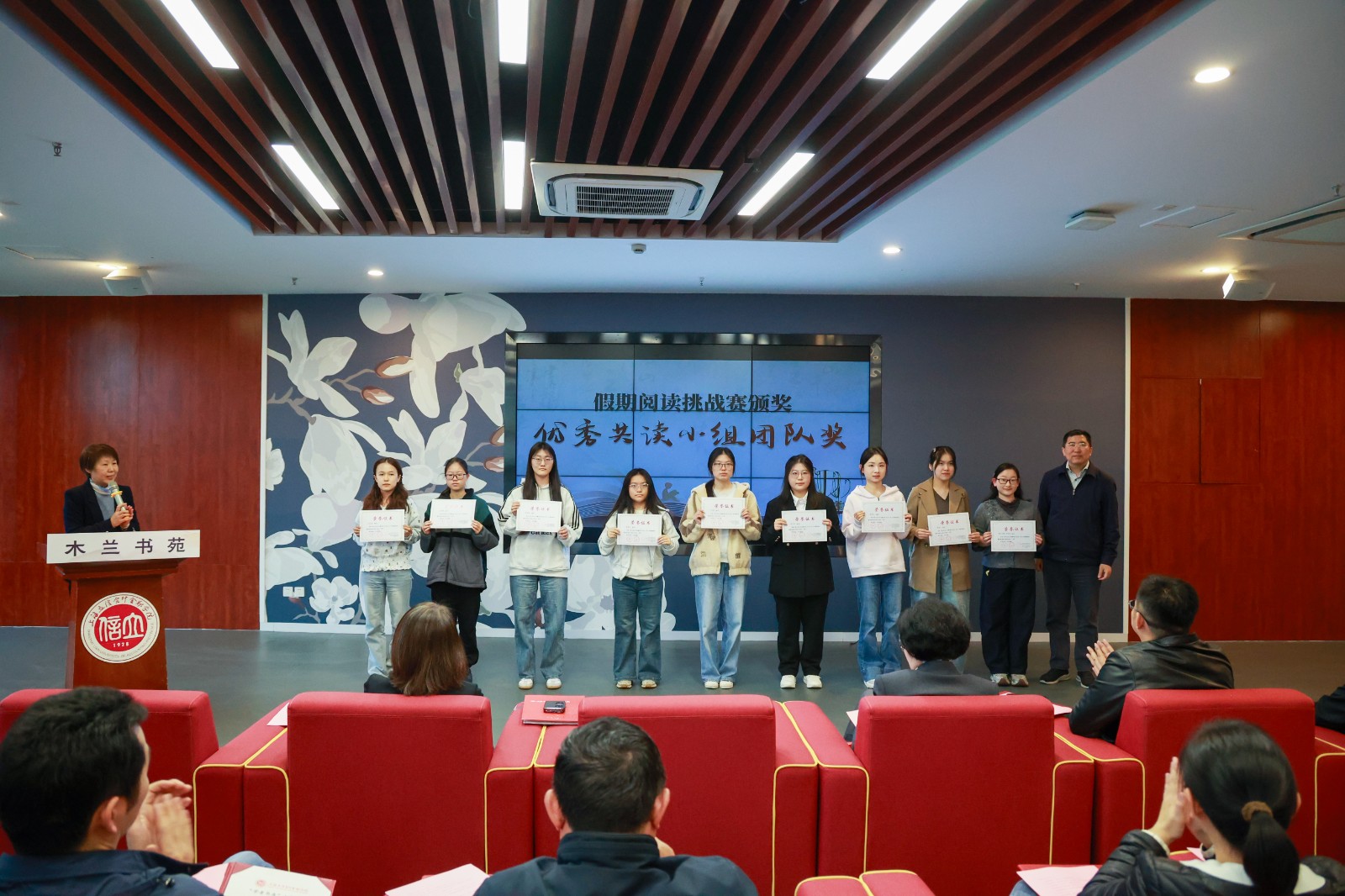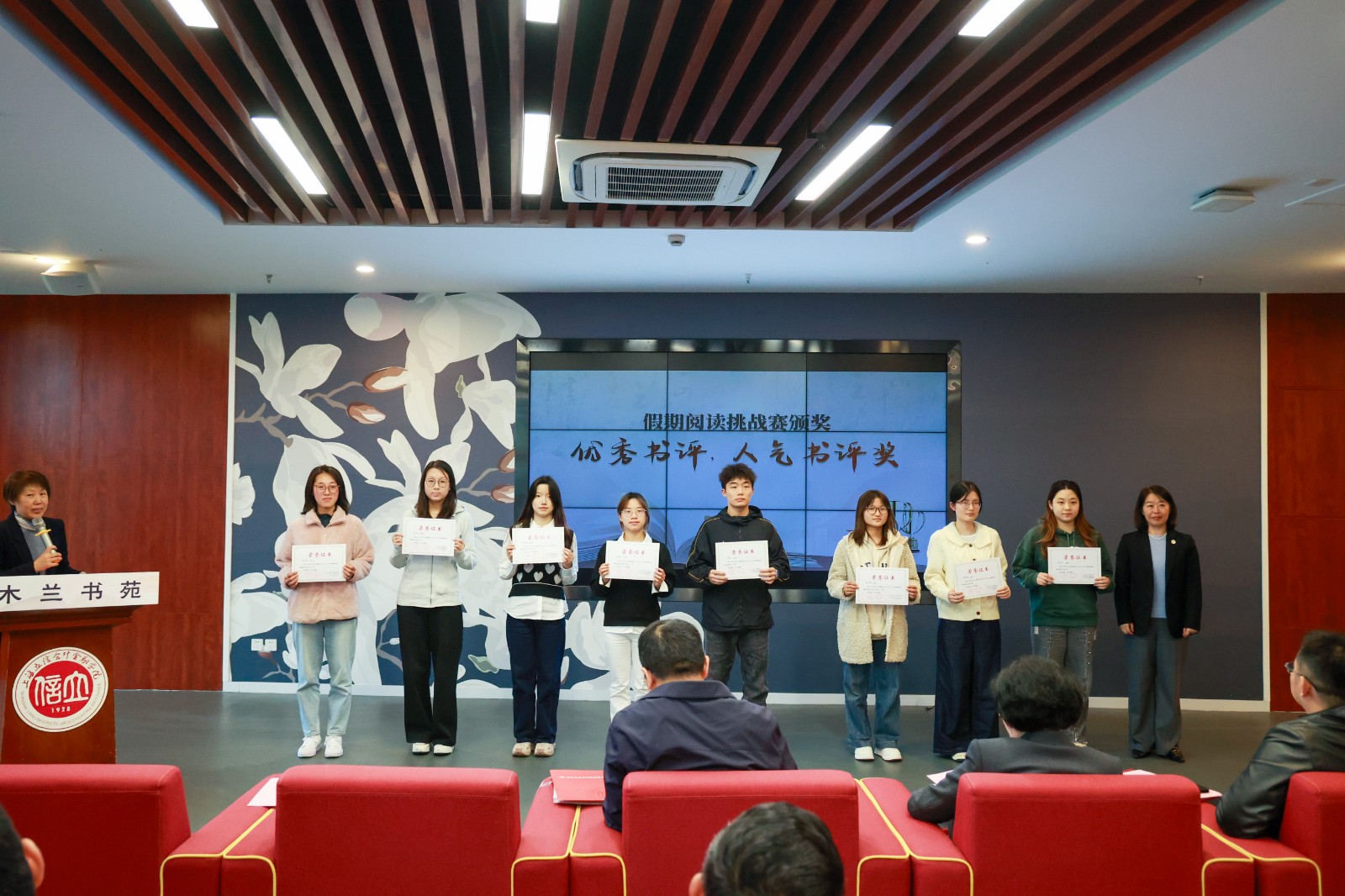 刘永琴为金融学院、保险学院、金融科技学院入驻学者颁发“学者书房”入藏证书,并为学校2025年度“阅读达人”获奖学生代表颁奖。她在致辞中表示,学校举行读书节开幕式暨“学者书房”入驻仪式,是深入学习贯彻习近平文化思想和《全民阅读促进条例》的生动实践。她希望学校“爱读书、读好书、善读书”的氛围更加浓郁,学校教师更加积极地参与“学者书房”建设,学校全民阅读促进工作的参与度、覆盖面和影响力进一步扩大。