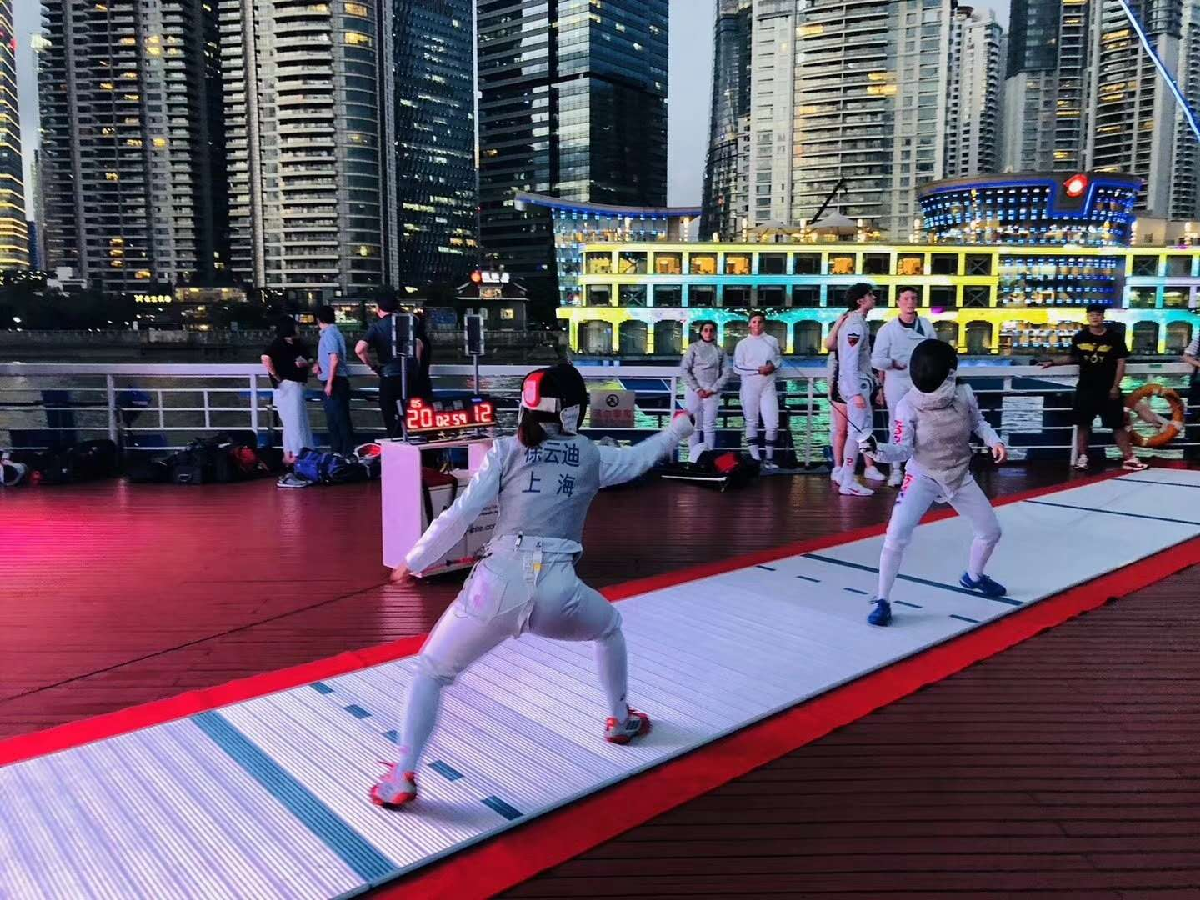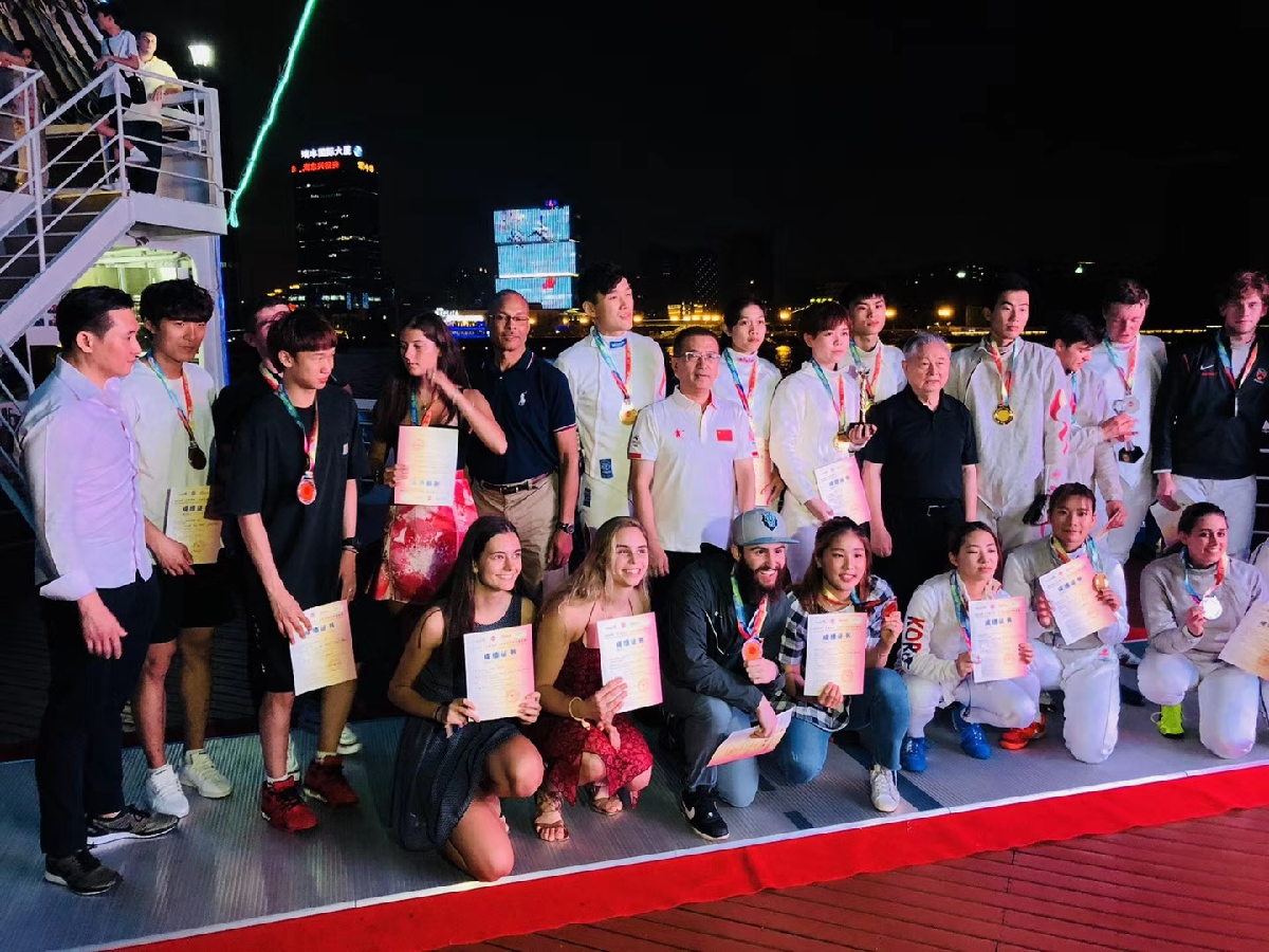 22日晚,在黃浦江游船“船长8号”的天台甲板上,来自全球各大学府的击剑高手上演“决胜局”。最后一块混合团体金牌,由我校与合肥学院、上海体育学院、南京体育学院运动员组成的中国高校联队拿下。