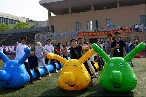 当天下午阳光明媚,参赛队员们热情高涨。本届运动会最受关注的运动项目是“快乐毛毛虫”,该项目是由八名队员一同骑在可爱亮眼的大型道具毛毛虫上,在指定跑道上完成。“有轨电车”项目需要十名队员两脚分别踩着木板,统一步伐共同前进。“摸石头过河”项目需要队员们通过三个海绵砖交替搭桥过“河”。经过努力拼搏,财税与公共管理学院代表队取得团体总分第一名,统计与数学学院和序伦书院代表队分获第二、三名。