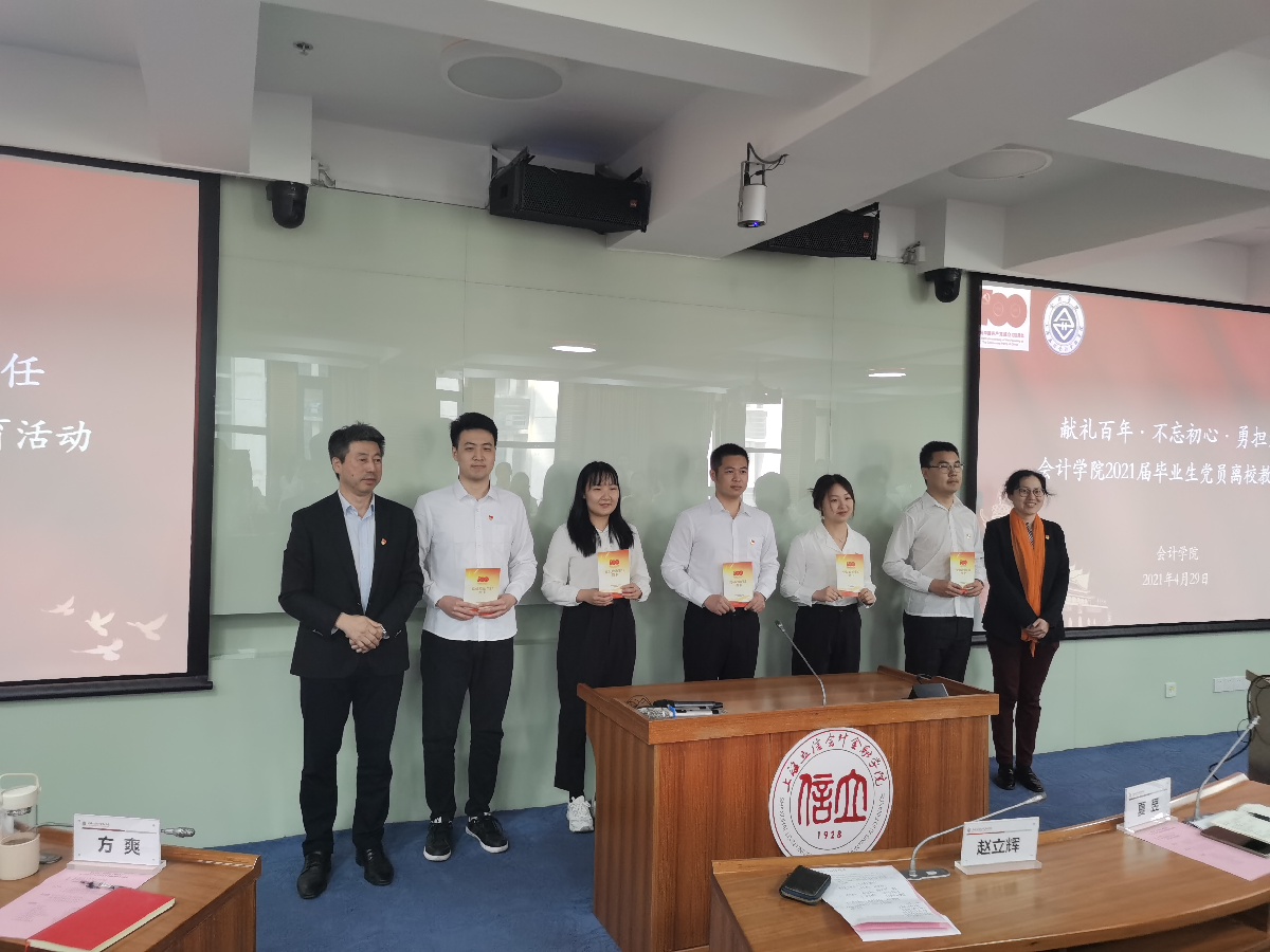 4月29日,会计学院于序伦大楼教师发展中心多功能厅举行“献礼百年·不忘初心·勇担大任”——2021届毕业生党员离校教育大会。会计学院党委书记赵立辉、副书记、副院长夏昱出席本次大会,会计学院专兼职组织员、支部书记及毕业班辅导员、2021届毕业生党员代表、党史党建学研社成员代表共同参与,大会通过腾讯会议进行线上同步转播。
