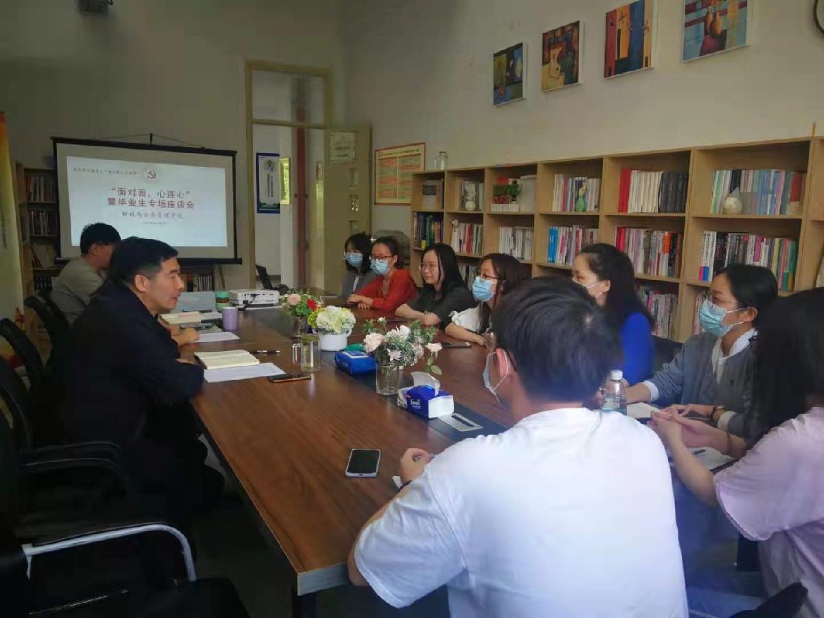 为进一步落实党史学习教育“我为群众办实事”活动,更好地服务学生,财税与公共管理学院于4月30日下午召开“面对面,心连心”毕业生专场座谈会。党总支书记闫锐、院长杨光焰、组织员孙黎黎、毕业班辅导员王洁、教务秘书张笑寒,以及部分毕业生代表出席了会议。