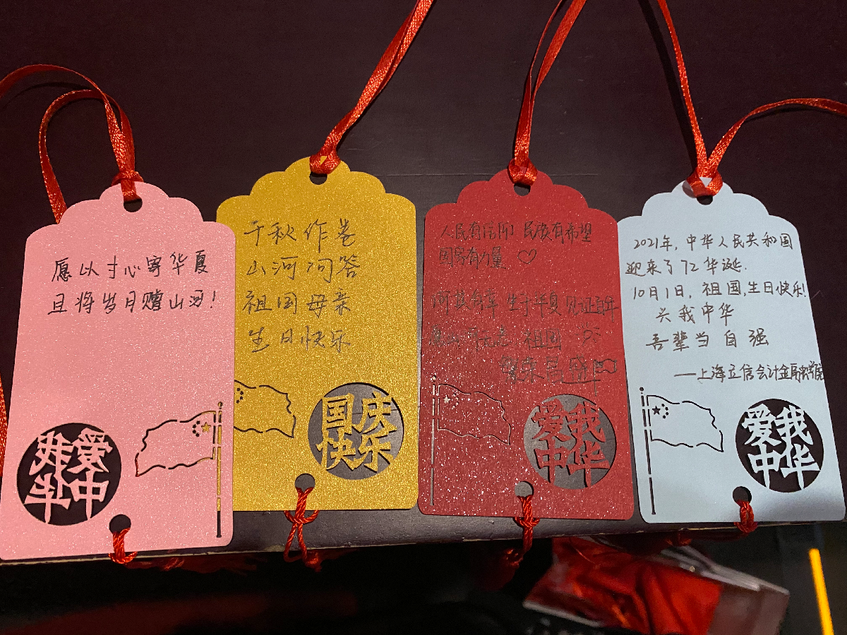 观影结束后,同学们在卡片上一笔一划写下对祖国的祝福话语,一字一句展现爱国情深,凝聚爱国情怀。