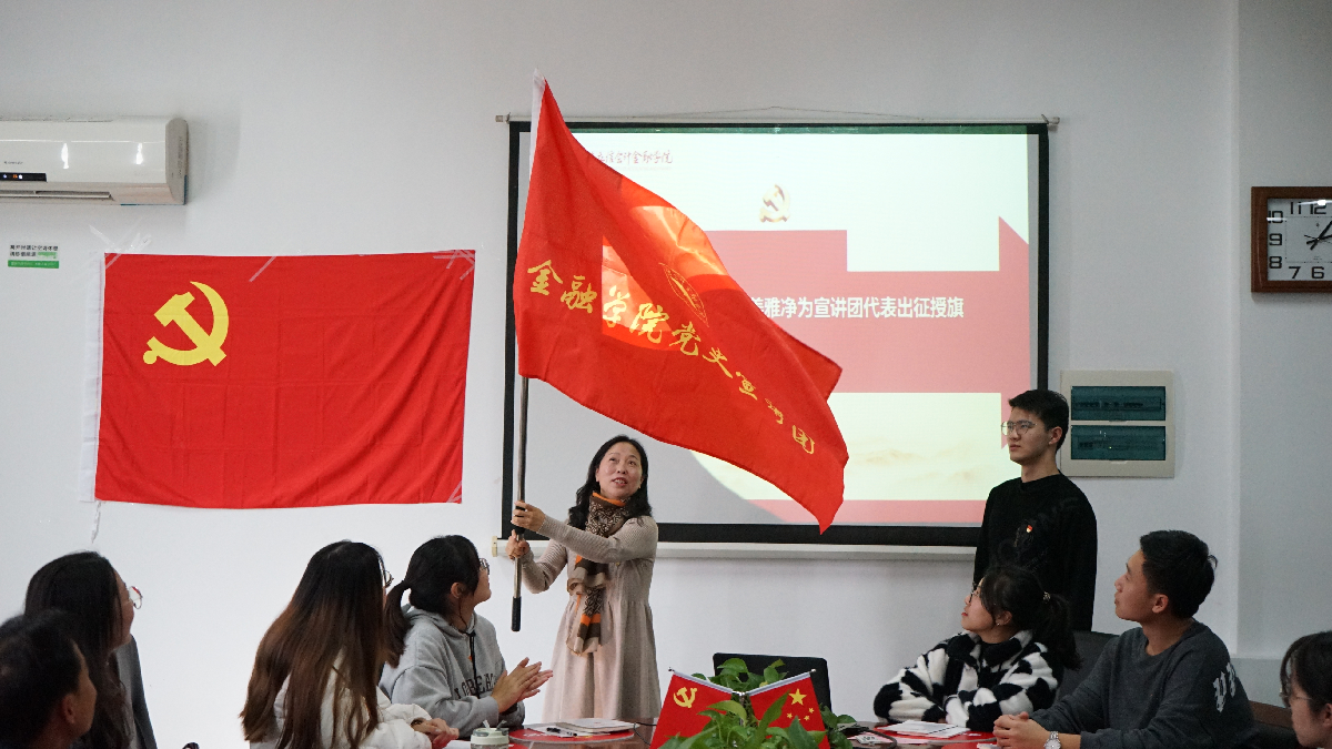 姜雅净从把握会议精神、把握宣传效果、把握防疫要求向宣讲团提出三点要求,希望“金小燕”们明确宣讲的目的与意义,“原汁原味”地宣讲会议精神;准确把握活动宣传效果,针对不同群体进行多样化宣传;提高自我保护意识,把握实时防疫要求,同时在宣讲过程中自觉将学理知识转化为自身党性修养,坚持知行合一,牢记立信人身份,擦亮立信品牌。随后她向宣讲团成员赠送十九届六中全会会议材料并授旗,赵倩雯向宣讲团赠送防疫物资。
