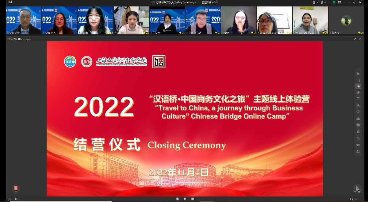 11月4日,由教育部中外语言交流合作中心主办,我校国际交流学院承办的“汉语桥·中国商务文化之旅”线上团组体验营正式拉下帷幕。我校国际交流处、国际交流学院负责人姚杰,孔子学院办公室全体教师与来自越南、俄罗斯、希腊、波兰等10个国家的480名学员共同参加结营仪式。
