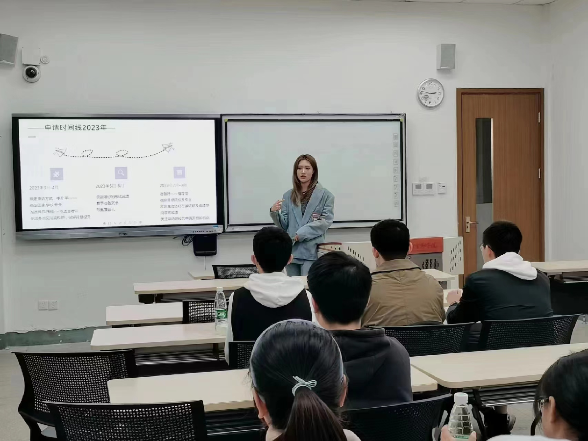 李尔娇从如何选择国家、学校、专业等计划留学前期申请准备、个人申请经历、留学期间学习生活状况及毕业后就业求职经验等四个方面进行专题分享,鼓励有出国交流学习意向的同学们学好专业课,做好语言考试准备工作,提前做好各项规划。