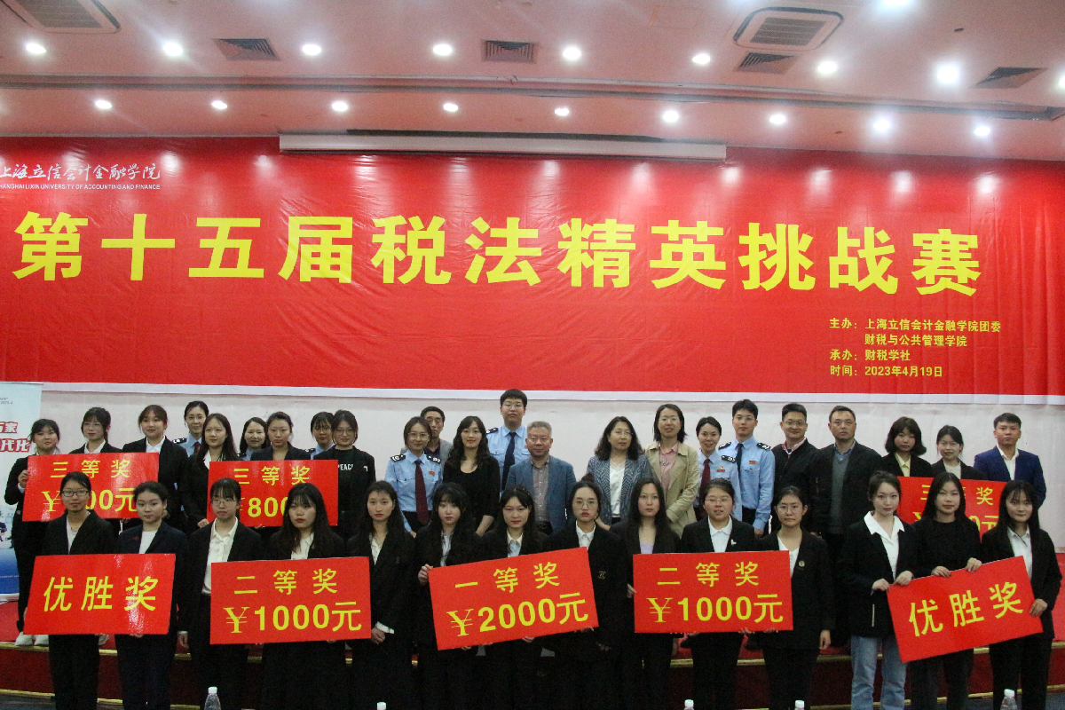 本届大赛于3月中旬启动,得到了上海市松江区税务局、上海市税务局第四稽查局以及上海市兄弟高校的大力支持,共有来自上海理工大学、上海商学院、上海海关学院和我校200余名学生参与了初赛的比拼,最终有8个小组脱颖而出。决赛分为两轮进行,依次设有必答题、抢答题、风险题等环节。经过两个多小时紧张激烈角逐,最终邹晨丹小组获得一等奖;王一婷小组、李可萱小组获得二等奖;黄梦思小组、王宛玉小组以及来自上海理工大学的李小海小组获得三等奖;陆心怡小组、沈琳荃小组获得优胜奖。