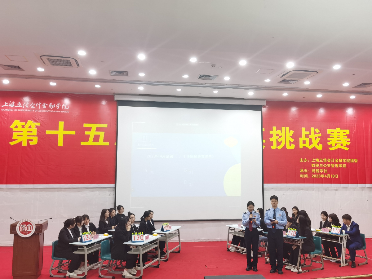 4月19日,由共青团上海立信会计金融学院委员会、财税与公共管理学院主办,财税学社承办的第十五届税法精英挑战赛决赛在文翔路校区举行。国家税务总局上海市松江区税务局副局长王春、国家税务总局上海市税务局第四稽查局副局长石海燕、上海立信会计金融学院财税与公共管理学院党总支副书记(主持党务工作)王亭,党总支副书记、副院长(挂职)顾正云与部分税务系教师出席比赛并担任评委。