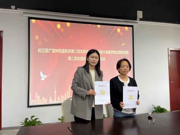 为深入学习宣传贯彻习近平新时代中国特色社会主义思想和党的二十大精神,充分发挥党建引领作用,5月11日,立信研究院第二党支部与广富林街道第二党支部,在广富林街道党群服务中心签订党建共建协议。双方将积极探索,利用好党建联建的合作交流平台,发挥党员先锋模范作用,找准工作载体,为共同推动社区基层治理创新,服务社会,实现共赢和新发展。