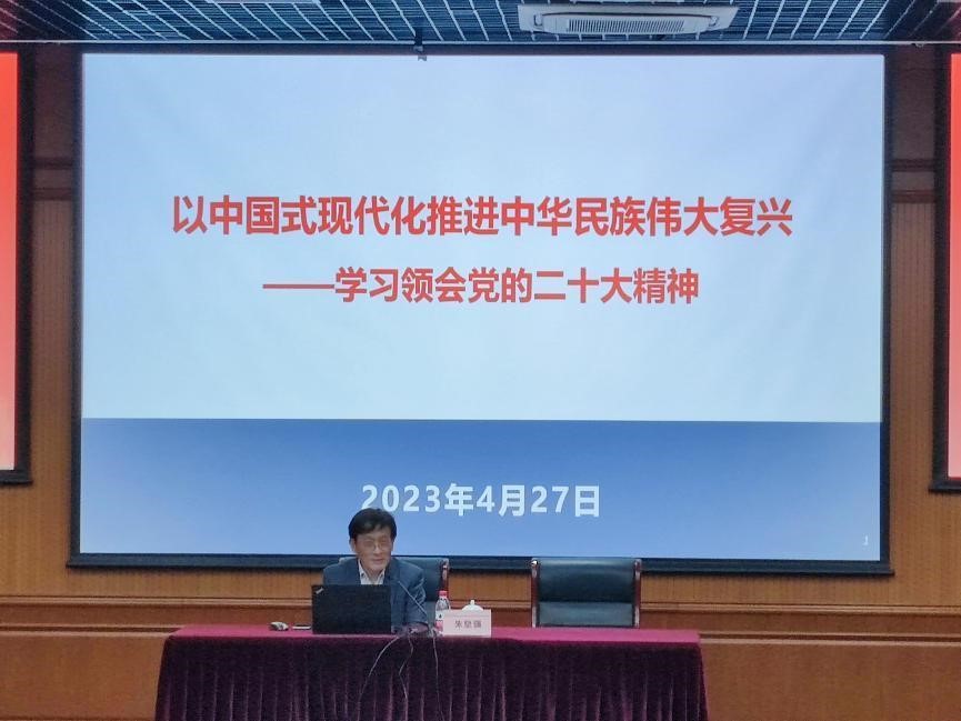 4月27日,离退休党委主办,联合继续教育学院、国际财经学院党总支,出版社党总支以及尚汇豪庭居民区党总支在中山西路校区共同组织开展“学习贯彻习近平新时代中国特色社会主义思想主题教育”联学共学活动。离退休党委副书记朱坚强教授作了题为《以中国式现代化推进中华民族伟大复兴——学习领会党的二十大精神》的专题报告。报告会由离退休党委副书记(主持工作)高晓颖主持。离退休党支部委员,继续教育学院、国际财经学院党总支全体党员,出版社全体职工,尚汇豪庭居民区党总支全体党员百余人聆听了报告。