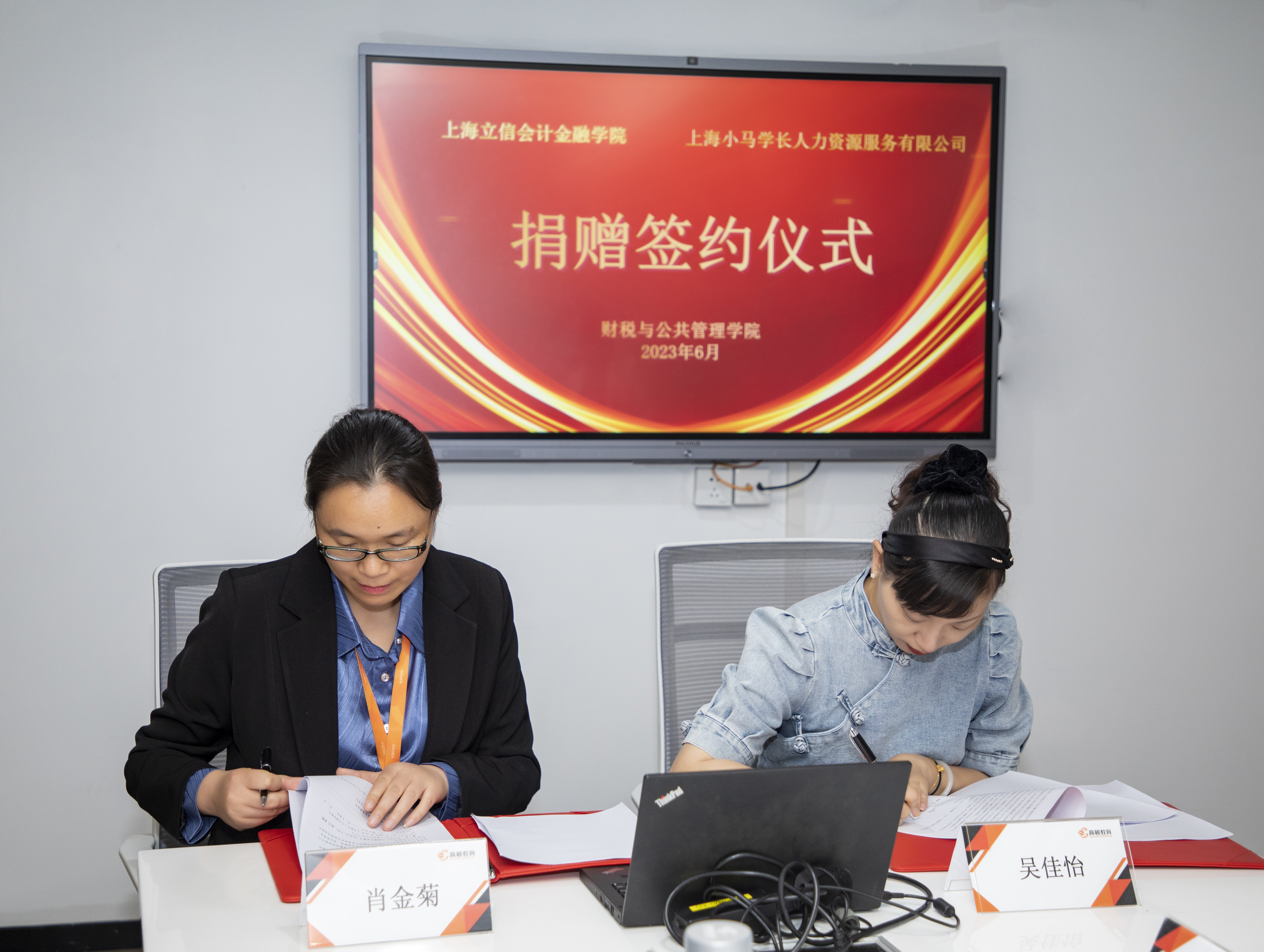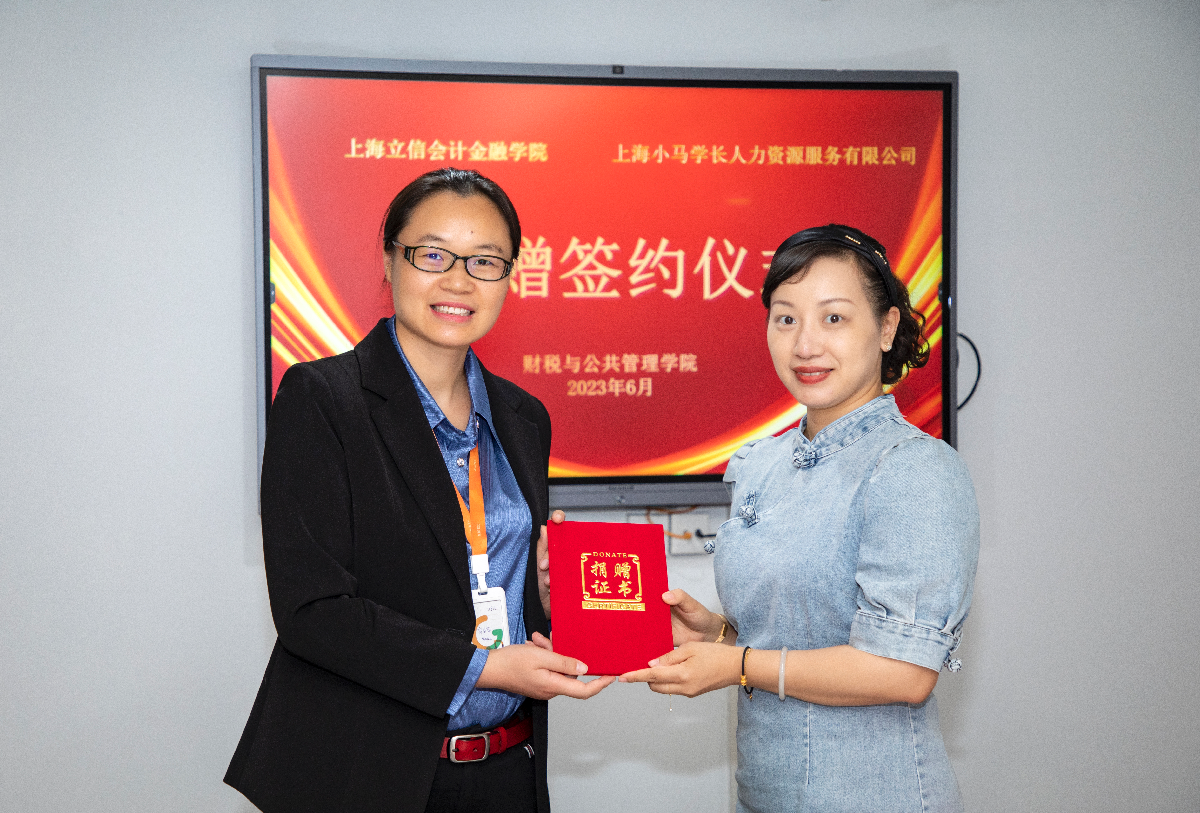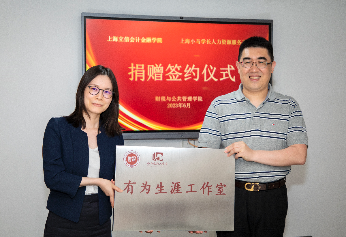 此次小马学长向我校潘序伦教育发展基金会捐款,在财税与公共管理学院设立“有为生涯工作室”,用于支持我校财税与公共管理学院人才培养和教育事业发展。仪式上,王亭简单介绍了上海小马学长人力资源服务有限公司的捐赠过程,校友事务及教育发展办公室副主任吴佳怡与小马学长总经理肖金菊共同签署了捐赠协议,并向小马学长颁发捐赠证书。小马学长副总经理耿龙霞为财税与公共管理学院“有为生涯工作室”授牌。