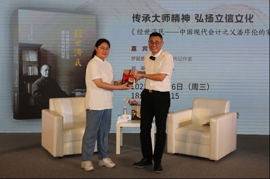 今年是潘序伦先生诞辰130周年。活动开始,立信会计出版社社长、总编辑华春荣致辞,发起青年一代传承大师精神、弘扬立信文化的倡议。活动通过知名记者、主持人刘凝女士与《经世济民——中国现代会计之父潘序伦的家国情怀》作者、学校罗银胜老师的对话,展现潘序伦先生作为会计学家、教育家、出版家在民族危亡之际展现出来的令人钦佩、敬仰的创新精神、奋斗精神。通过对谈,读者们了解到一个立体的、可触摸的、可感知的一代宗师形象:他和我们每个人一样,年轻时也曾轻狂,也走过弯路,求学坎坷,屡屡失业;他的青春也是和我们一样,是奋斗的闪闪发光的青春。在哈佛大学和哥伦比亚大学留学期间,他夜以继日、废寝忘食,“不知什么是假期,也不知道什么是游戏娱乐,自朝至夕,总在书堆里过日子”。