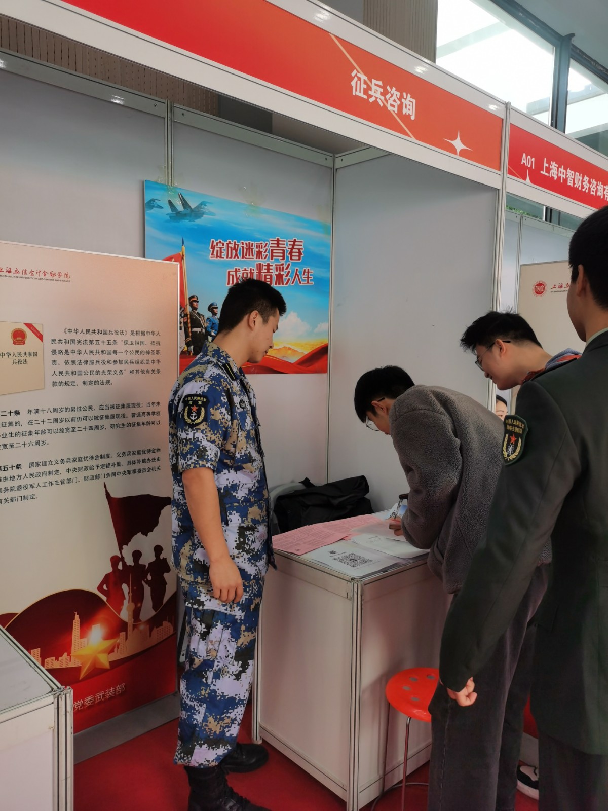 在现场,参加招聘会的2024届毕业生陆续前来咨询应届大学生应征入伍相关优惠政策,也有不少低年级学生咨询在校生当兵政策。党委武装部老师和国旗班退伍大学生骨干通过发放宣传资料、宣讲入伍政策、现场登记报名等方式全方位、多角度为有意愿参军的同学提供各项服务保障,就应征入伍的基本条件、具体流程为学生作了说明,并就学生们关心的落户政策、优抚待遇、学费减免、复学转专业、毕业生入伍提干等相关问题作了详细解答。