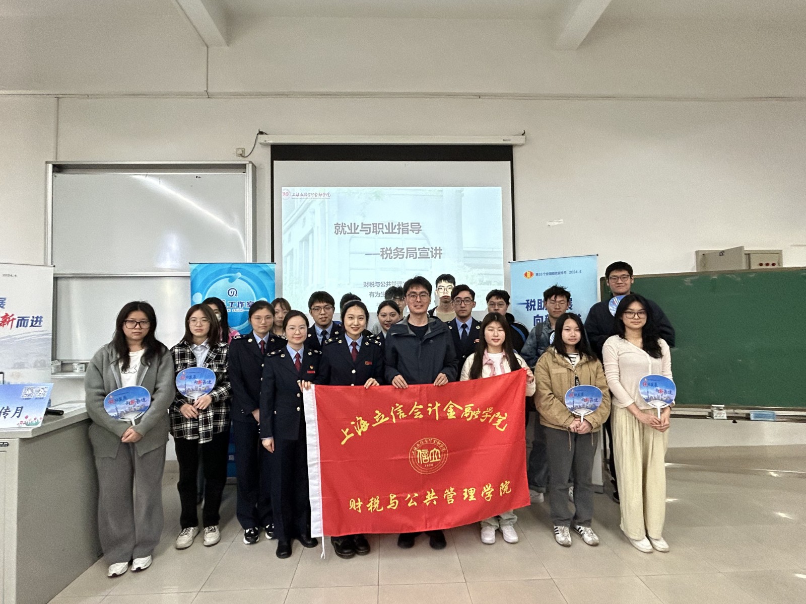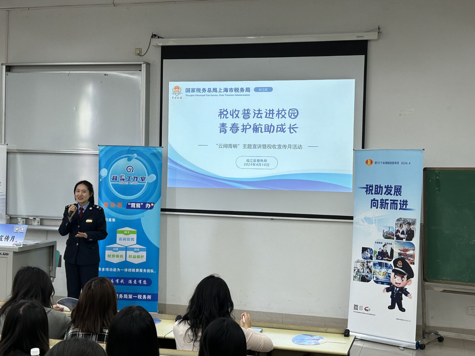 为更好地迎接学校审核评估,推动税法知识在学院学生中走实、走深,助力学院学子在职业规划、专业学习等方面更好地成长,传达第33个税法宣传月“税助发展,向前而进”主题精神,4月10日,财税与公共管理学院在文翔路校区举办“税收普法进校园,青春护航助成长”税法宣传进校园活动。本次活动由财税与公共管理学院协同松江区税务局第一税务所“茸易”工作室共同举办。