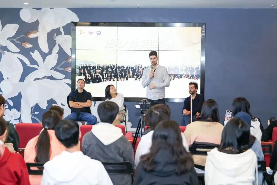 校团委书记沈丹致欢迎辞。随后,星海艺术团交响乐团的同学们带来了精心编排的Disney favorites。詹卢卡·坎波对艺术团同学的长笛演奏《渔舟唱晚》进行了指导,针对性给出气息控制的专业建议,特别强调了呼吸与乐句之间的关系,帮助同学更好地表达音乐的意境。德田智子对同学演奏维奥蒂第二十三协奏曲选段进行了指导,提醒他注重弓速均匀,特别强调了换弓与指法的流畅性,以及如何通过细微的力度变化来增强音乐的层次感。贝内迪克特·洛斯在指导同学演奏维瓦尔第的SONATA VII第二乐章时,着重讲解了如何通过放松身体的节奏和手指的力度来表达音乐的情感变化,强调音乐不仅是单方面的演奏,更要与演出现场观众进行联动。纪尧姆·库卢米在指导同学小号演奏时特别强调了口型、气息与音准之间的关系,帮助同学在演奏中展现出更加饱满和富有层次的音色。指导结束后,四位音乐家与星海艺术团师生开展了对谈交流。