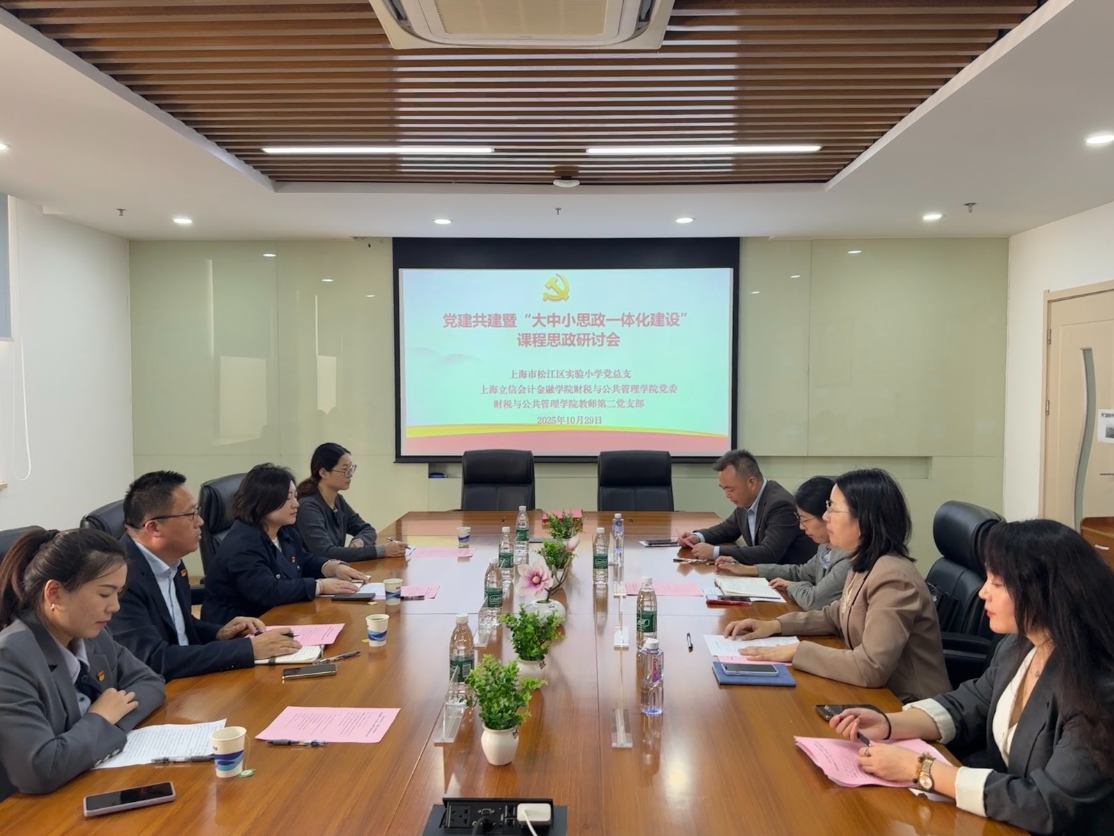 10月29日,财税与公共管理学院和松江区实验小学在文翔路校区举行党建共建暨“大中小思政一体化建设”课程思政研讨会。松江区实验小学党总支书记倪军、副校长陈婷,财税与公共管理学院党委书记王亭等出席。