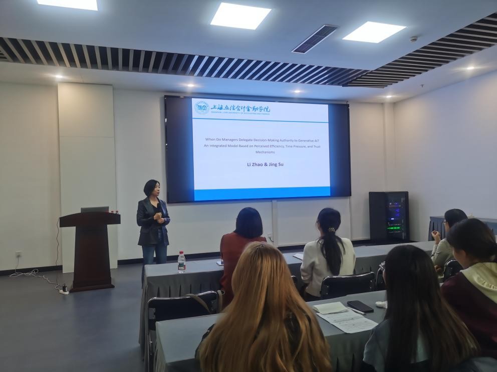苏靖围绕“When Do Managers Delegate Decision-Making Authority to Generative AI? An Integrated Model Based on Perceived Efficiency, Time Pressure, and Trust Mechanisms”主题进行分享,深入剖析管理者向生成式人工智能(GAI)授权决策的心理机制与情境约束因素。